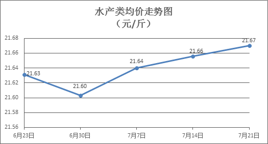 水产类商品价格微幅上涨。所监测的10种水产商品价格波动情况为5涨2跌3平,综合均价为每斤21.67元,环比上涨0.06%。其中:草鱼、鲢鱼、鲈鱼、罗非鱼、基围虾零售均价分别为每斤11.26元、9.17元、21.71元、8.90元、29.82元,环比分别上涨0.45%、下降0.86%、上涨0.65%、上涨0.34%、下降0.40%。