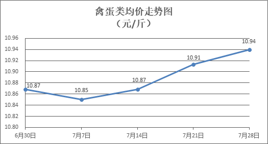 禽蛋类商品价格总体微涨。所监测的6种禽蛋类商品价格波动情况为4涨1跌1平,综合零售均价为每斤10.94元,环比上涨0.24%。其中:白条鸡、白条鸭零售均价分别为每斤19.98元、15.12元,环比分别下降0.05%、上涨0.13%;白壳鸡蛋、咸鸭蛋零售均价分别为每斤6.49元、9.00元,环比分别上涨0.15%、持平。
