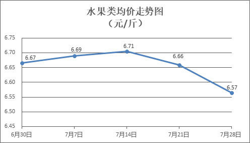 水果类商品价格小幅波动。所监测的6种水果商品价格波动情况为3涨1跌2平,综合零售均价为每斤6.57元,环比下降1.40%。其中橙子、苹果、葡萄零售均价分别为每斤5.66元、7.53元、14.21元,环比分别持平、上涨0.80%、下降4.82%。