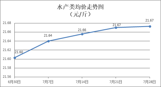 水产类商品价格微幅盘整。所监测的10种水产商品价格波动情况为3涨4跌3平,综合均价为每斤21.67元,环比上涨0.01%。其中:草鱼、鲢鱼、鲈鱼、罗非鱼、基围虾零售均价分别为每斤11.29元、9.25元、21.97元、8.90元、29.74元,环比分别上涨0.27%、上涨0.87%、上涨1.20%、持平、下降0.27%。
