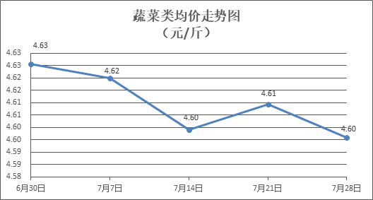 据本市21家农贸市场监测数据显示,上周(7月22日至7月28日)市场上各类“菜篮子”商品供应充足,所监测的7大类“菜篮子”商品价格周环比4涨2跌1平。其中:粮油类商品价格基本平稳,肉禽蛋类商品价格总体略涨,蔬果类、水产类价格窄幅盘整。受连续强降雨影响,肉禽蛋商品价格略有上涨,预计高温多雨天气持续,部分肉菜价格偏强运行。