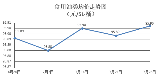 食用油类商品价格基本平稳。所监测的9种食用油(5L装)商品价格波动情况为1涨1跌7平,综合零售均价为每桶95.90元,环比上涨0.01%。其中:金龙鱼花生油、菜籽油零售均价分别为每桶103.21元、73.07元,环比分别下降0.06%、上涨0.19%。