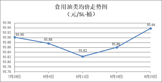 食用油类商品价格微幅盘整。所监测的9种食用油(5L装)商品价格波动情况为3涨2跌4平,综合零售均价为每桶95.94元,环比上涨0.08%。其中:胡姬花花生油、玉米油零售均价分别为每桶144.75元、77.60元,环比分别持平、上涨0.08%。