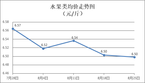 水果类商品价格小幅波动。所监测的6种水果商品价格波动情况为2涨4跌,综合零售均价为每斤6.50元,环比下降0.08%。其中橙子、葡萄、西瓜零售均价分别为每斤5.83元、13.37元、3.22元,环比分别上涨0.52%、下降0.30%、下降0.31%。
