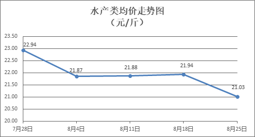 鲜虾类商品有所下调。所监测的9种水产商品价格波动情况为3涨5跌1平,综合均价为每斤21.03元,环比下降4.18%。其中:草鱼、鲢鱼、罗非鱼、海虾零售均价分别为每斤11.18元、9.78元、8.92元、50.00元,环比分别下降0.27%、上涨2.09%、下降0.11%、下降14.34%。
