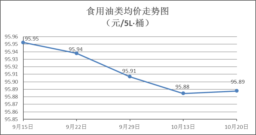 食用油类商品价格基本平稳。所监测的9种食用油(5L装)商品价格波动情况为1涨8平,综合零售均价为每桶95.89元,环比上涨0.01%。其中:金龙鱼花生油、金龙鱼调和油零售均价为每桶102.7元、71.29元,环比分别上涨0.03%、持平。