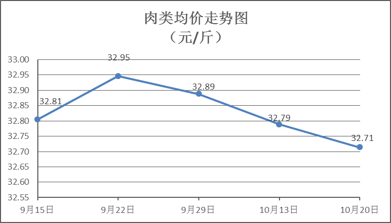 猪肉类商品价格继续下调。所监测的8种肉类商品价格波动情况为2涨6跌,综合零售均价为每斤32.71元,环比下降0.23%。其中:排骨、精瘦肉、牛肉、带骨羊肉零售均价分别为每斤32.40元、20.30元、45.74元、41.52元,环比分别下降0.98%、下降0.34%、上涨0.15%、上涨0.10%。