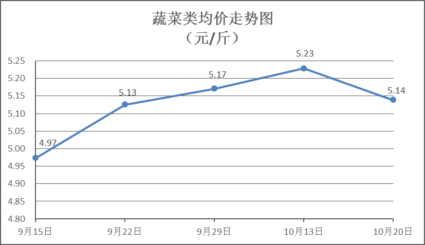 蔬菜类商品价格小幅回落。所监测的32 种蔬菜商品价格波动情况为10涨22跌,综合零售均价为每斤5.14元,环比下降1.72%。其中:涨幅居前的品种包括西芹、花菜、青尖椒,零售均价分别为每斤6.03元、6.53元、6.67元,环比分别上涨4.51%、1.40%、1.37%;跌幅靠前的品种包括苦瓜、本地菜心、水东芥菜,零售均价分别为每斤4.63元、5.24元、4.39元,环比分别下降9.57%、8.23%、5.39%。