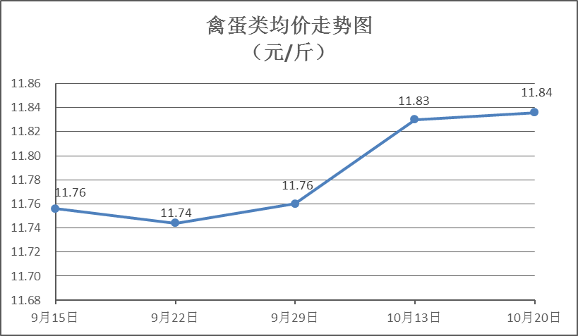 禽蛋类商品价格窄幅盘整。所监测的5种禽蛋类商品价格波动情况为2涨1跌2平,综合零售均价为每斤11.84元,环比上涨0.05%。其中:白条鸡、白条鸭零售均价分别为每斤20.35元、15.32元,环比分别上涨0.20%、持平;鸡蛋、鸭蛋零售均价分别为每斤6.55元、7.78元,环比分别下降0.30%、上涨0.13%。
