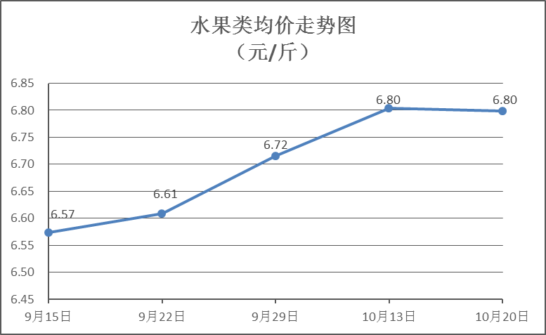 水果类商品价格微幅波动。所监测的6种水果商品价格波动情况为4涨2跌,综合零售均价为每斤6.80元,环比下降0.07%。其中橙子、苹果、葡萄零售均价分别为每斤6.79元、7.48元、13.62元,环比分别下降2.30%、下降0.53%、上涨0.44%。