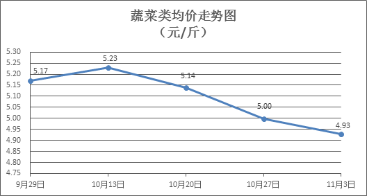 据本市21家农贸市场监测数据显示,上周(10月28日至11月3日)市场上各类“菜篮子”商品供应充足,所监测的7大类“菜篮子”商品价格总体表现为2涨3跌2平。其中:粮油类商品价格保持平稳,禽蛋类、水产类商品价格有所上涨,肉类、蔬菜类、水果类商品价格有所下降。本周天气晴好, 应季蔬菜供应持续稳定,我市蔬菜类商品价格呈持续下降态势,目前正处于消费淡季,预计部分肉菜类商品价格或持续回调。