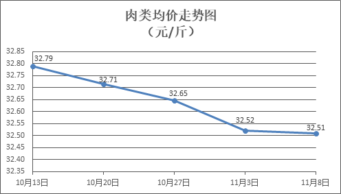 肉类商品价格有所微降。所监测的8种肉类商品价格波动情况为3涨5跌,综合零售均价为每斤32.51元,环比下降0.04%。其中:排骨、精瘦肉、牛肉、带骨羊肉零售均价分别为每斤32.26元、20.13元、45.81元、46.69元,环比分别下降0.11%、下降0.17%、下降0.02%、上涨0.27%。