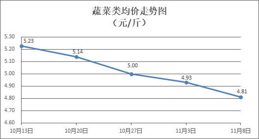 蔬菜类商品价格总体下降。所监测的32 种蔬菜商品价格波动情况为7涨25跌,综合零售均价为每斤4.81元,环比下降2.53%。其中:价格涨幅靠前的品种包括丝瓜、黄瓜、红萝卜,零售均价分别为每斤4.86元、3.93元、3.17元,环比分别上涨4.43%、2.48%、1.21%;跌幅靠前的品种包括西洋菜、花菜、菜心,零售均价分别为每斤5.14元、5.97元、4.59元,环比分别下降8.23%、8.03%、6.21%。
