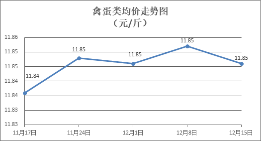 禽蛋类商品价格略有回调。所监测的5种禽蛋类商品价格波动情况为1涨4跌,综合零售均价为每斤11.85元,环比下降0.05%。其中:白条鸡、白条鸭零售均价分别为每斤20.53元、15.30元,环比分别上涨0.15%、下降0.07%;鸡蛋、鸭蛋零售均价分别为每斤6.55元、7.69元,环比分别下降0.15%、下降0.26%。