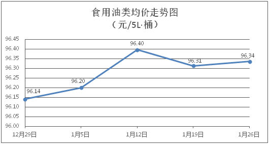 食用油类商品价格稳中微涨。所监测的9种食用油(5L装)商品价格波动情况为2涨7平,综合零售均价为每桶96.34元,环比上涨0.03%。其中:鲁花花生油、金龙鱼调和油零售均价为每桶155.94元、71.96元,环比分别上涨0.10%、上涨0.14%。