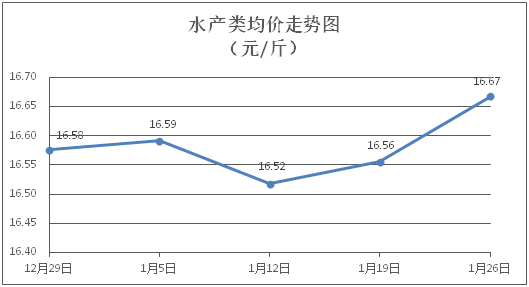 水产类商品价格微幅上涨。所监测的9种水产商品价格波动情况为6涨2跌1平,综合均价为每斤16.67元,环比上涨0.68%。其中:草鱼、鲫鱼、罗非鱼、鳙鱼、基围虾零售均价分别为每斤11.05元、14.21元、9.10元、10.55元、29.67元,环比分别上涨1.47%、上涨0.78%、下降0.11%、上涨0.76%、上涨0.82%。
