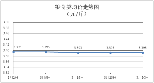 粮食类商品价格基本平稳。所监测的4种粮食类商品价格均持平,综合零售均价为每斤3.393元。其中:丝苗米、面粉零售均价分别为每斤3.53元、3.40元,环比均持平。