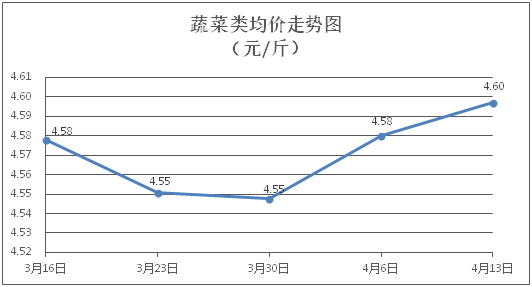 蔬菜类商品价格升降互现。所监测的32 种蔬菜商品价格波动情况为17涨14跌1平,综合零售均价为每斤4.60元,环比上涨0.37%。其中:涨幅居前的品种包括苦瓜、菠菜、水空心菜,零售均价分别为每斤6.49元、4.94元、5.35元,环比分别上涨5.36%、4.88%、4.29%;跌幅靠前的品种包括丝瓜、白苋菜、韭菜,零售均价分别为每斤4.98元、4.71元、4.90元,环比分别下降6.57%、3.88%、3.73%。