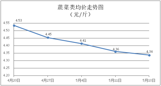 蔬菜类商品价格涨少跌多。所监测的32 种蔬菜商品价格波动情况为9涨17跌6平,综合零售均价为每斤4.34元,环比下降0.54%。其中:涨幅居前的品种包括本地菜心、水东芥菜、芥兰,零售均价分别为每斤4.87元、3.92元、5.09元,环比分别上涨2.53%、2.35%、1.60%;跌幅靠前的品种包括苦瓜、水空心菜、青豆角,零售均价分别为每斤4.63元、3.92元、5.71元,环比分别下降6.46%、5.54%、2.39%。