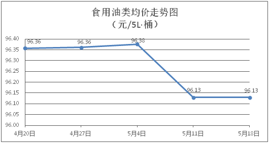 食用油类商品价格微幅波动。所监测的9种食用油(5L装)商品价格波动情况为4涨4跌1平,综合零售均价为每桶96.13元,环比下降0.001%。其中:金龙鱼花生油、玉米油零售均价为每桶102.12元、76.24元,环比分别下降0.23%、上涨0.05%。