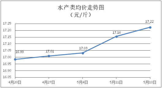 水产类商品价格小幅上涨。所监测的9种水产商品价格波动情况为5涨1跌3平,综合均价为每斤17.22元,环比上涨0.40%。其中:草鱼、鲫鱼、罗非鱼、基围虾零售均价分别为每斤11.18元、14.27元、9.14元、30.50元,环比分别持平、上涨0.21%、上涨0.44%、上涨0.23%。