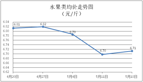 水果类商品价格窄幅盘整。所监测的6种水果商品价格波动情况为2涨1跌3平,综合零售均价为每斤6.71元,环比上涨0.22%。其中橙子、香蕉、梨零售均价分别为每斤6.35元、3.41元、5.39元,环比分别上涨0.95%、上涨1.19%、下降0.19%。