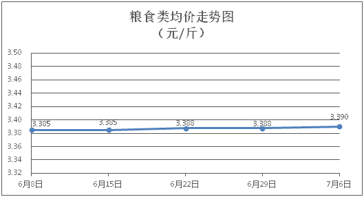 粮食类商品价格基本平稳。所监测的4种粮食类商品价格波动情况为1涨3平,综合零售均价为每斤3.390元,环比上涨0.07%。其中:珍珠米、面粉零售均价分别为每斤3.10元、3.40元,环比分别上涨0.32%、持平。