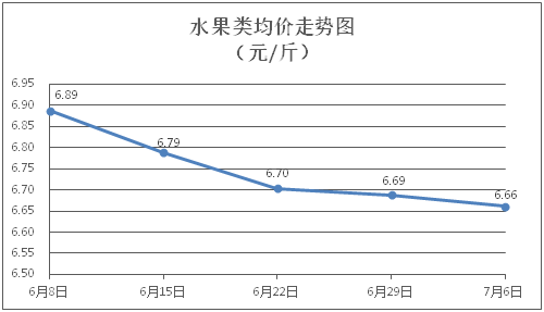 水果类商品价格持续走弱。所监测的6种水果商品价格波动情况为1涨4跌1平,综合零售均价为每斤6.66元,环比下降0.40%。其中橙子、苹果、葡萄零售均价分别为每斤6.42元、7.64元、13.83元,环比分别下降0.31%、上涨0.13%、下降0.65%。