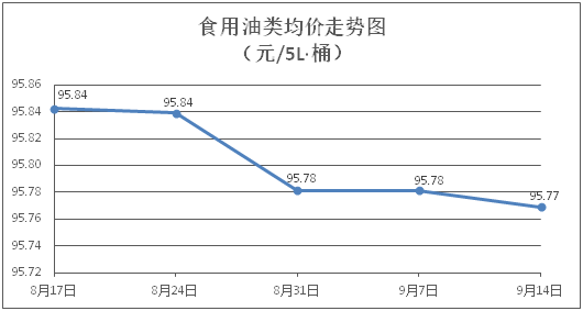 食用油类商品价格稳中微降。所监测的9种食用油(5L装)商品价格波动情况为2涨3跌4平,综合零售均价为每桶95.77元,环比下降0.01%。其中:鲁花花生油、菜籽油零售均价分别为每桶156.42元、73.52元,环比分别上涨0.06%、下降0.08%。