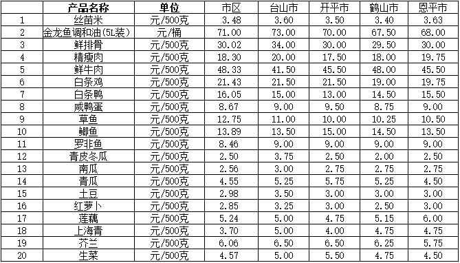 说明:1、表中价格为该地区监测点综合平均价;2、“市区”含蓬江区、江海区、新会区,价格分别采自蓬江市场、江南市场、城东市场等13家农贸市场;3、其他四个县市价格分别采自新华市场、锦江市场等8家农贸市场。