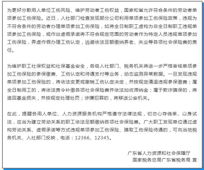 01-广州市海珠区查处虚构劳动关系办理单项参保行为 2024年1月,广州市海珠区人社局通过核查参保人举报线索,发现某人力资源服务公司通过“假外包、真挂靠”,将其他公司的全日制职工虚构为本公司非全日制职工,签订虚假用工协议,违规办理单项参加工伤保险。目前,该公司已被当地人社部门立案查处,并退回骗取的工伤保险待遇。 02-韶关市曲江区查处违规为非特定人员办理单项参保行为 2023年12月起,韶关市曲江区人社局按照省市统一部署,开展工伤认定风险排查整治专项行动,发现某公司在为建立劳动关系职工办理参保时,将“临近退休人员”“试用期人员”“临时工”等群体错误按“其他从业人员”类型单项参加工伤保险。目前税务机关已责令该公司纠正错误参保关系,为存在劳动关系的职工补缴各项社会保险费,并按规定加收滞纳金。 链接二:相关法律法规 单位违规单项参加工伤保险、违规办理社保业务,可能会承担多个法律责任。 01-弄虚作假办理社保业务的法律责任 参保单位在工伤认定申请中,如果提供虚假用工协议、虚假考勤资料等材料的,根据《广东省社会保险基金监督条例》第六十一条处理处罚。 第六十一条 以欺诈、伪造证明材料、冒用他人证件、虚构劳动关系等手段办理社会保险业务的,社会保险行政部门、社会保险费征收机构、社会保险经办机构不予办理,将有关情况记入其信用档案;情节严重的,处涉案金额一倍以上三倍以下的罚款。以欺诈、伪造证明材料、虚构劳动关系或者其他手段骗取社会保险待遇的,由社会保险行政部门责令退还已骗取的社会保险待遇,并处骗取金额二倍以上五倍以下的罚款。 02-未依法开展人力资源服务的法律责任 人力资源服务机构如果将用人单位职工改变为本机构的职工,串通损害职工合法权益的,根据《人力资源市场暂行条例》第四十三条规定处理处罚。 第三十条 经营性人力资源服务机构接受用人单位委托提供人力资源服务外包的,不得改变用人单位与个人的劳动关系,不得与用人单位串通侵害个人的合法权益。 第四十三条 违反本条例...第三十条...规定,...未依法开展人力资源服务业务的,由人力资源社会保障行政部门责令改正;有违法所得的,没收违法所得;拒不改正的,处1万元以上5万元以下的罚款;情节严重的,吊销人力资源服务许可证;给个人造成损害的,依法承担民事责任。违反其他法律、行政法规的,由有关主管部门依法给予处罚。 03-未按时足额缴纳社会保险费的法律责任 如用人单位违规只为建立劳动关系的职工选择参加工伤保险,未按时足额缴纳养老、医疗、失业等社会保险费的,根据《社会保险法》第八十六条规定加收滞纳金、罚款。 第八十六条 用人单位未按时足额缴纳社会保险费的,由社会保险费征收机构责令限期缴纳或者补足,并自欠缴之日起,按日加收万分之五的滞纳金;逾期仍不缴纳的,由有关行政部门处欠缴数额一倍以上三倍以下的罚款。 04-骗保的法律责任 参保单位通过将发生工伤的“老职工”伪造为新入职职工参保,或者在申领工伤保险待遇时提供虚假垫付医疗费用说明等方式,骗取工伤保险待遇的,根据《社会保险法》第八十八条处罚,达到规定金额的,依法追究刑事责任。 第八十八条 以欺诈、伪造证明材料或者其他手段骗取社会保险待遇的,由社会保险行政部门责令退回骗取的社会保险金,处骗取金额二倍以上五倍以下的罚款。 第九十四条 违反本法规定,构成犯罪的,依法追究刑事责任。 解读:开平市人力资源和社会保障局执法一大队 咨询方式:0750-2257325