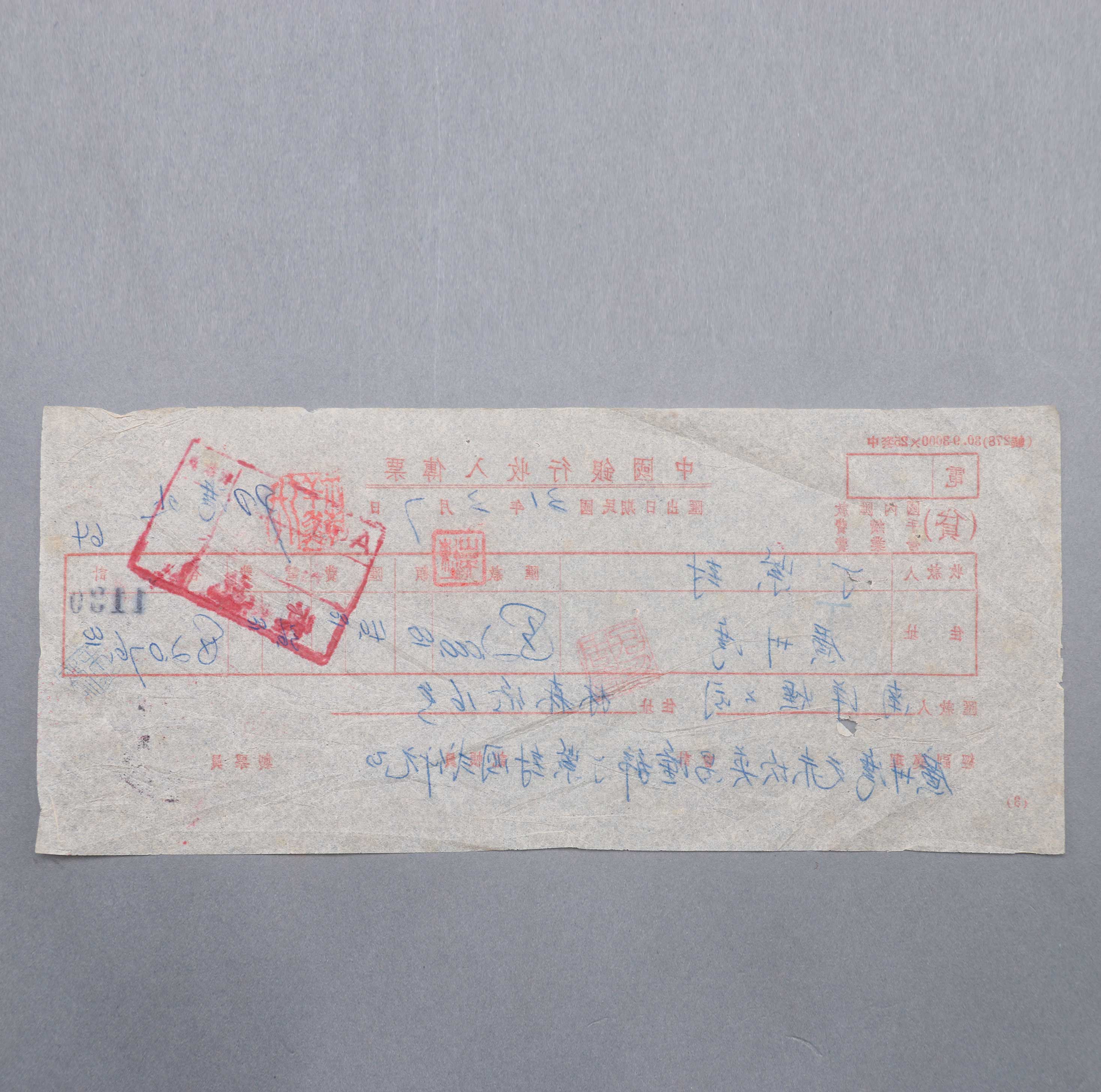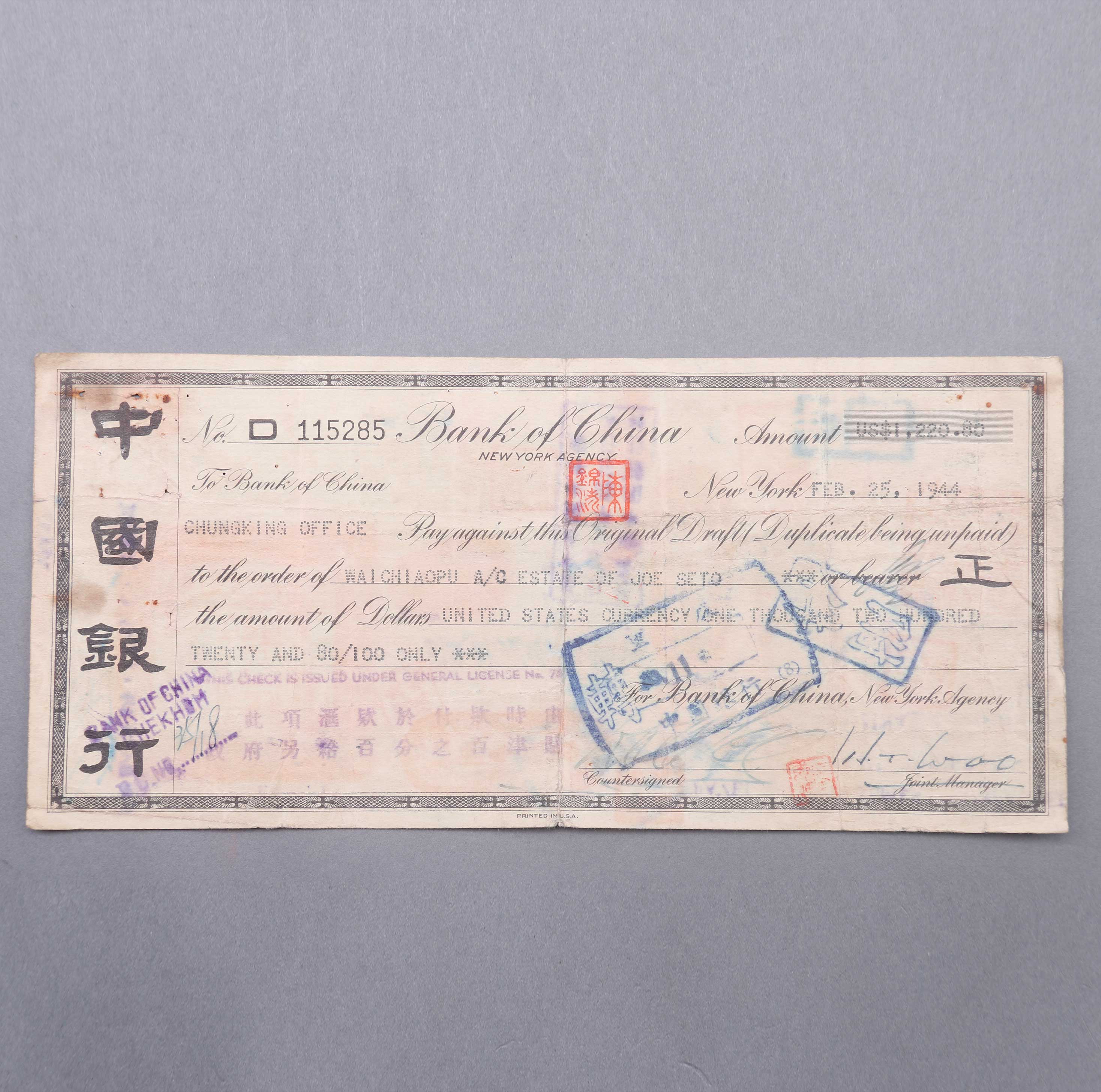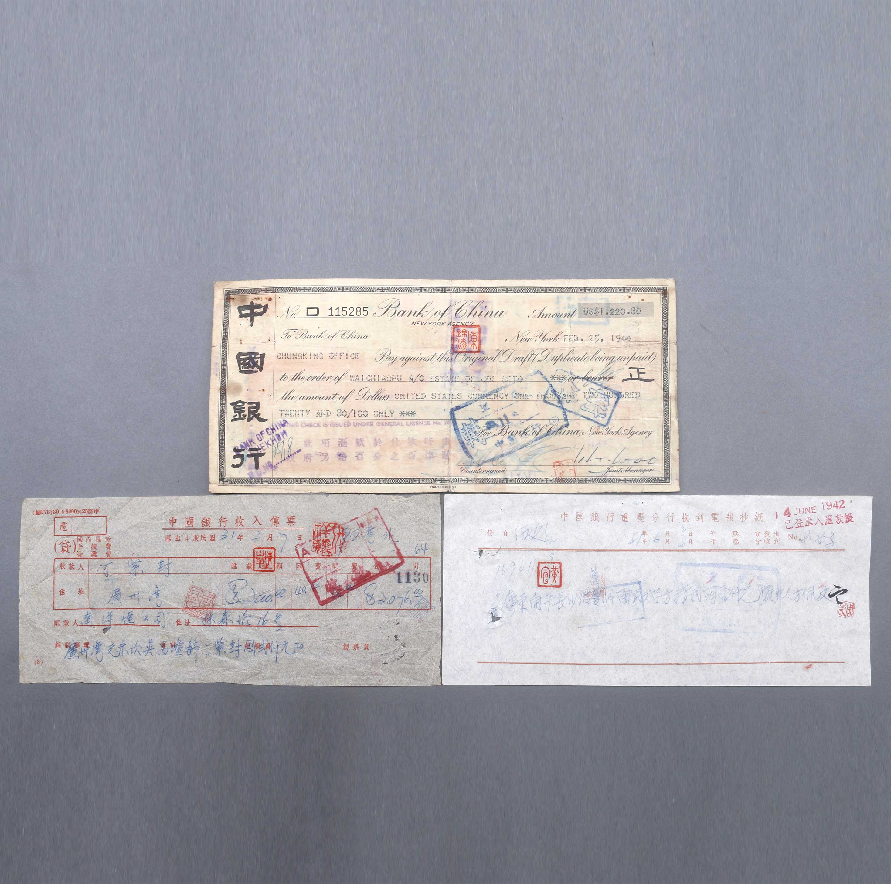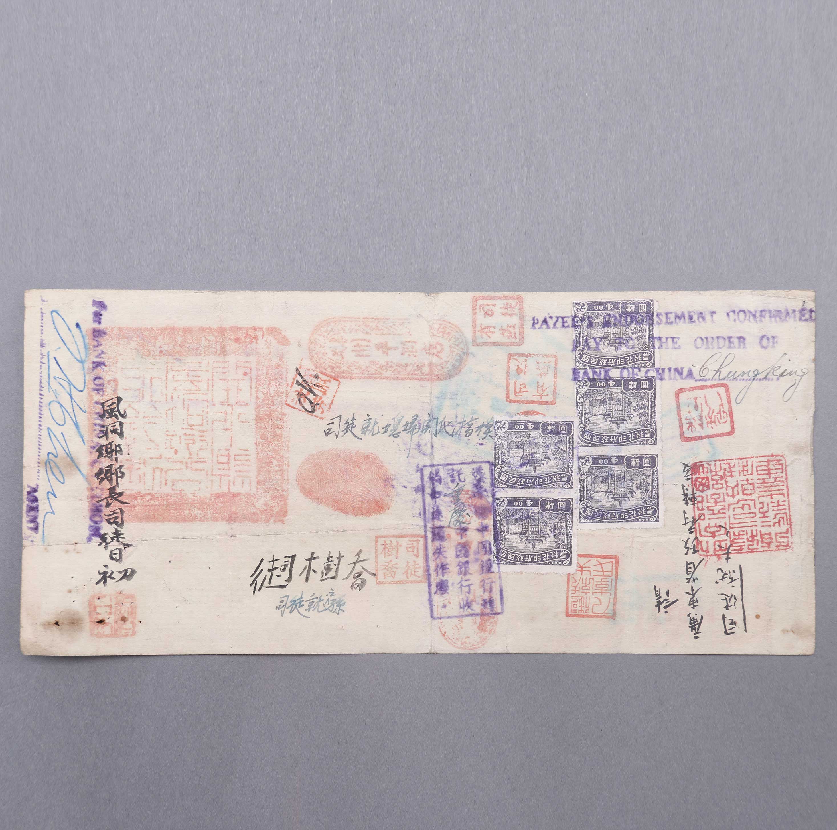 年代:中华民国三十一年;尺寸:长23cm,宽10.4cm。纸质,平面长方形。汇票,当时俗称“昃纸”或“赤纸”。此汇票正面由中国银行印制及签发,文字为英文;背面由开平风洞乡乡长司徒日初签署,并有“中国银行”印鉴及贴有“国民政府印花税票”五张(20元)。