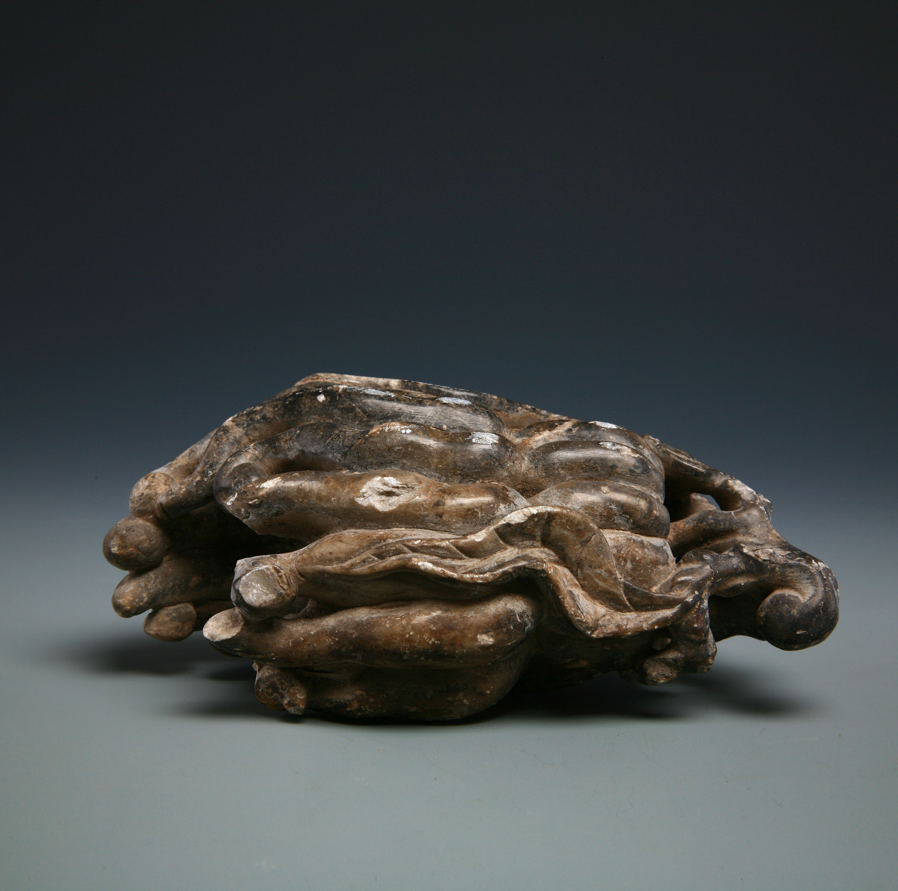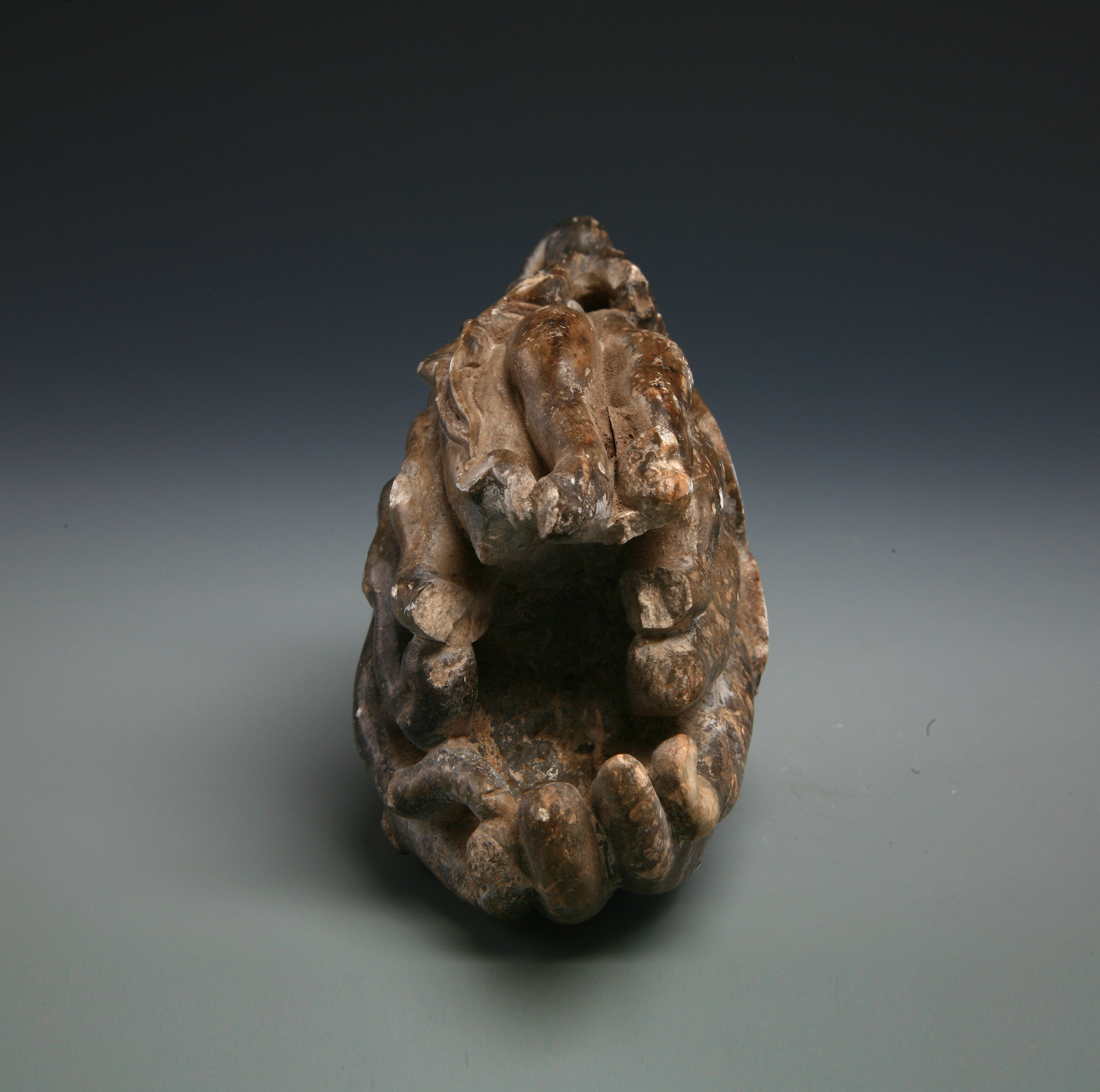 年代:20世纪;尺寸:通长16.3cm,通宽6.7cnm,高9.5 cm。石质雕制,长身,形不规整,上为树叶形,下为手指形,整体为佛手瓜摆件。