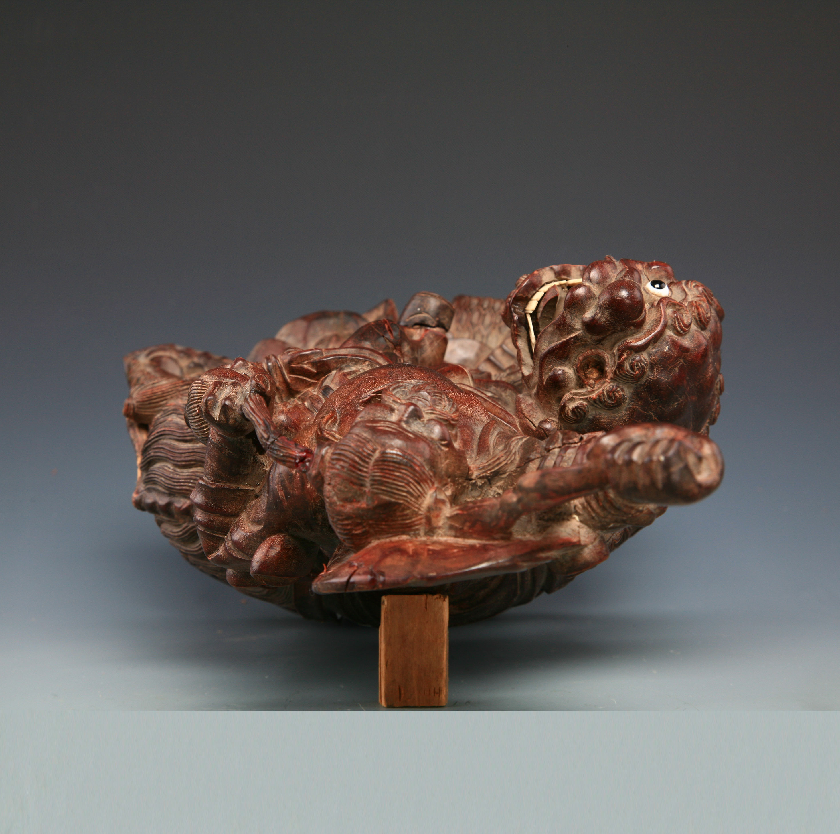 年代:清;尺寸:通宽22.7cm,厚13.9cm,高41cm。黄褐色木制作。麒麟上有两个人物,上为老者,长鬚,瞪眼,坦胸露肚,双臂穿衣,右手高举。下为持物童子。麒麟扭头张口仰望,面目狰狞。背上有鞍,前后刻出排列整齐的鬃毛,四足站立。其下又刻出松果作座。
