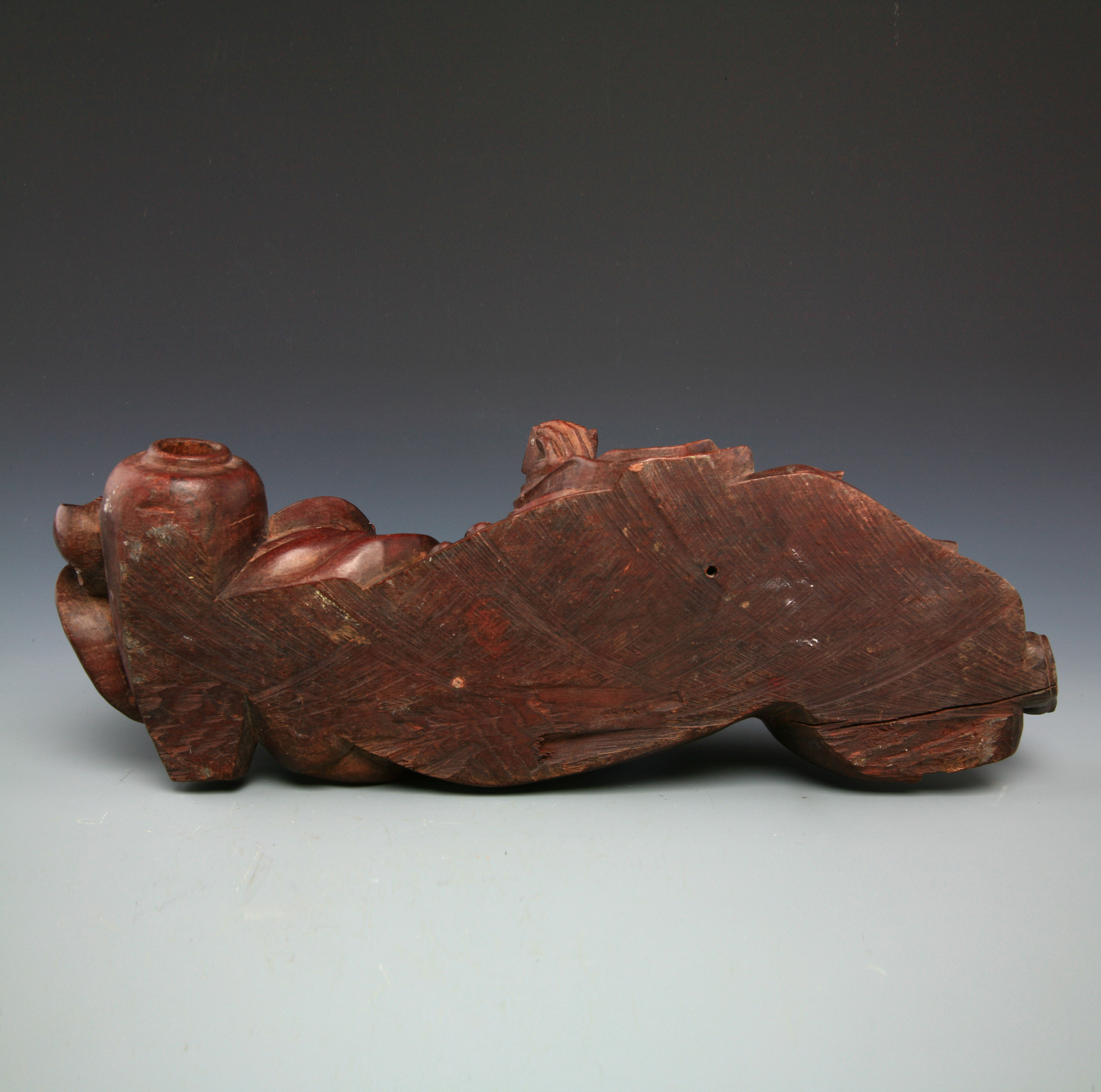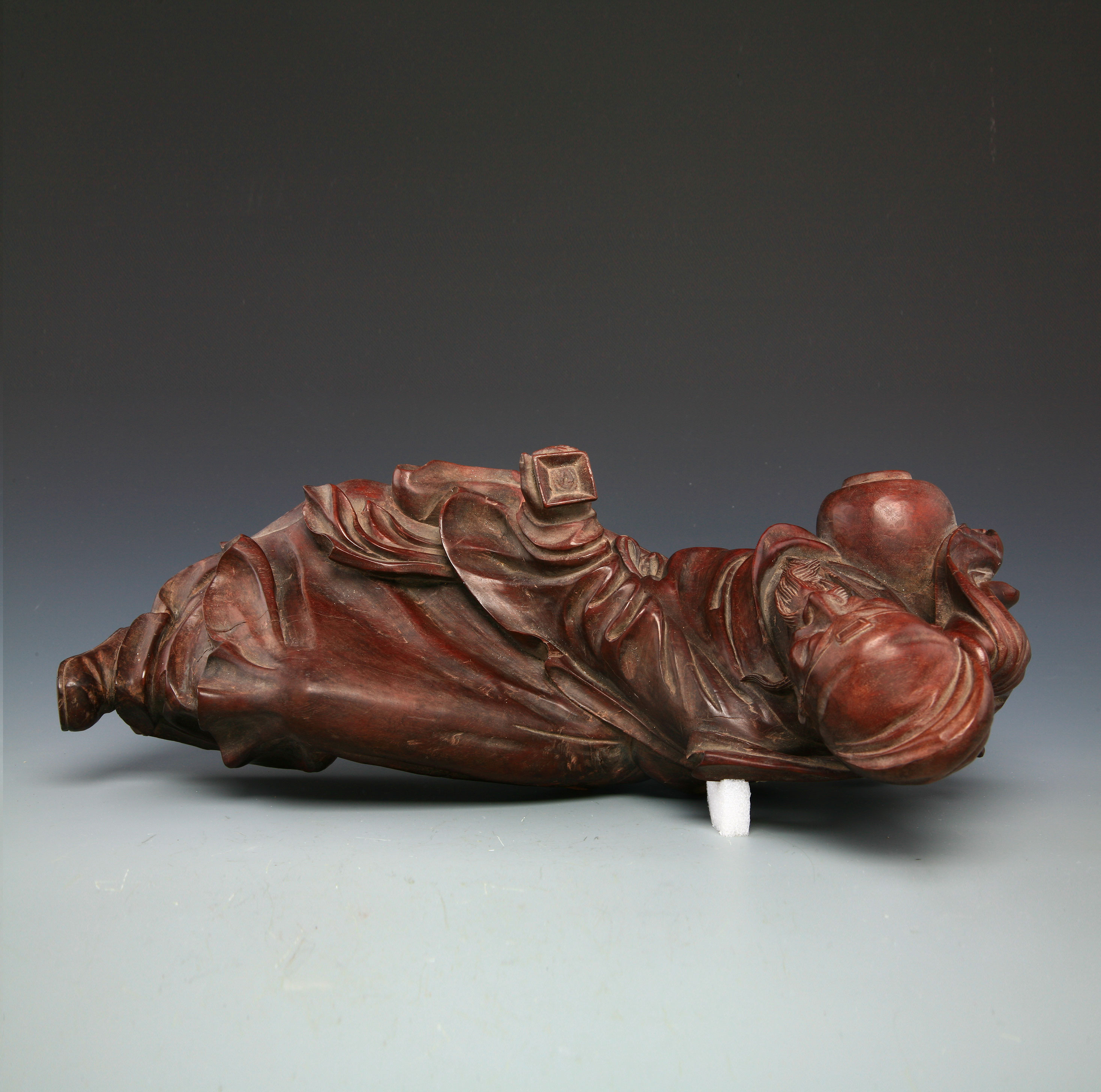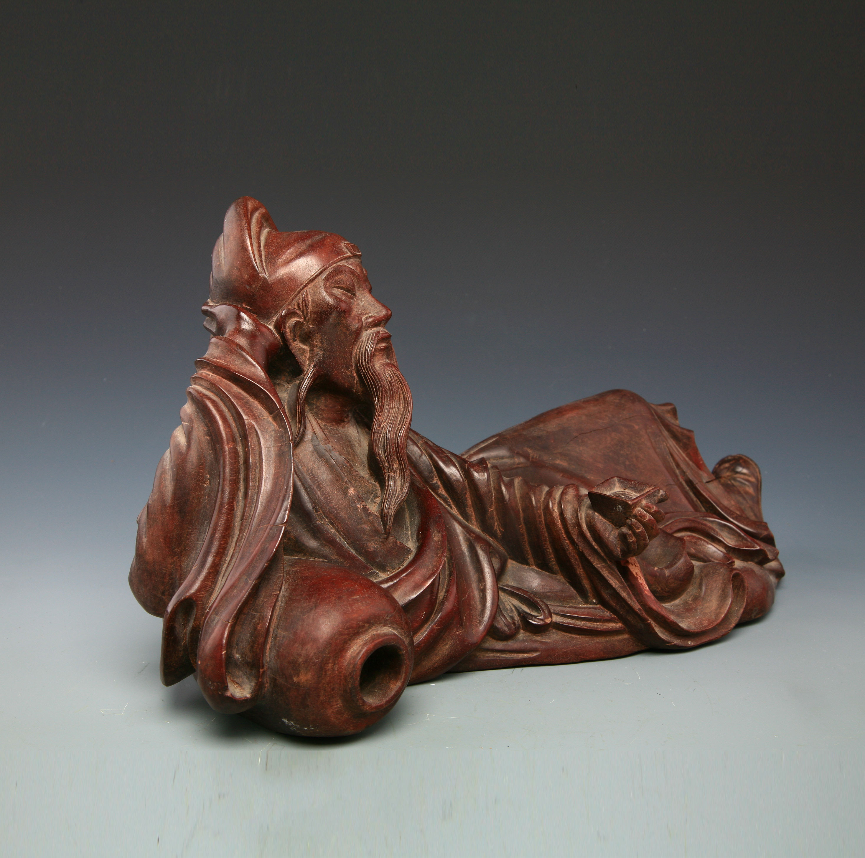 年代:清;尺寸:通长40cm,厚5.5cm,通高7.7cm。木质黄褐色,有裂痕。头戴帽饰,眯眼,长鬚,身穿衣袍,侧卧,一靴露出。右手托于右耳之上,左手握杯盏,胸前酒埕已倒侧。