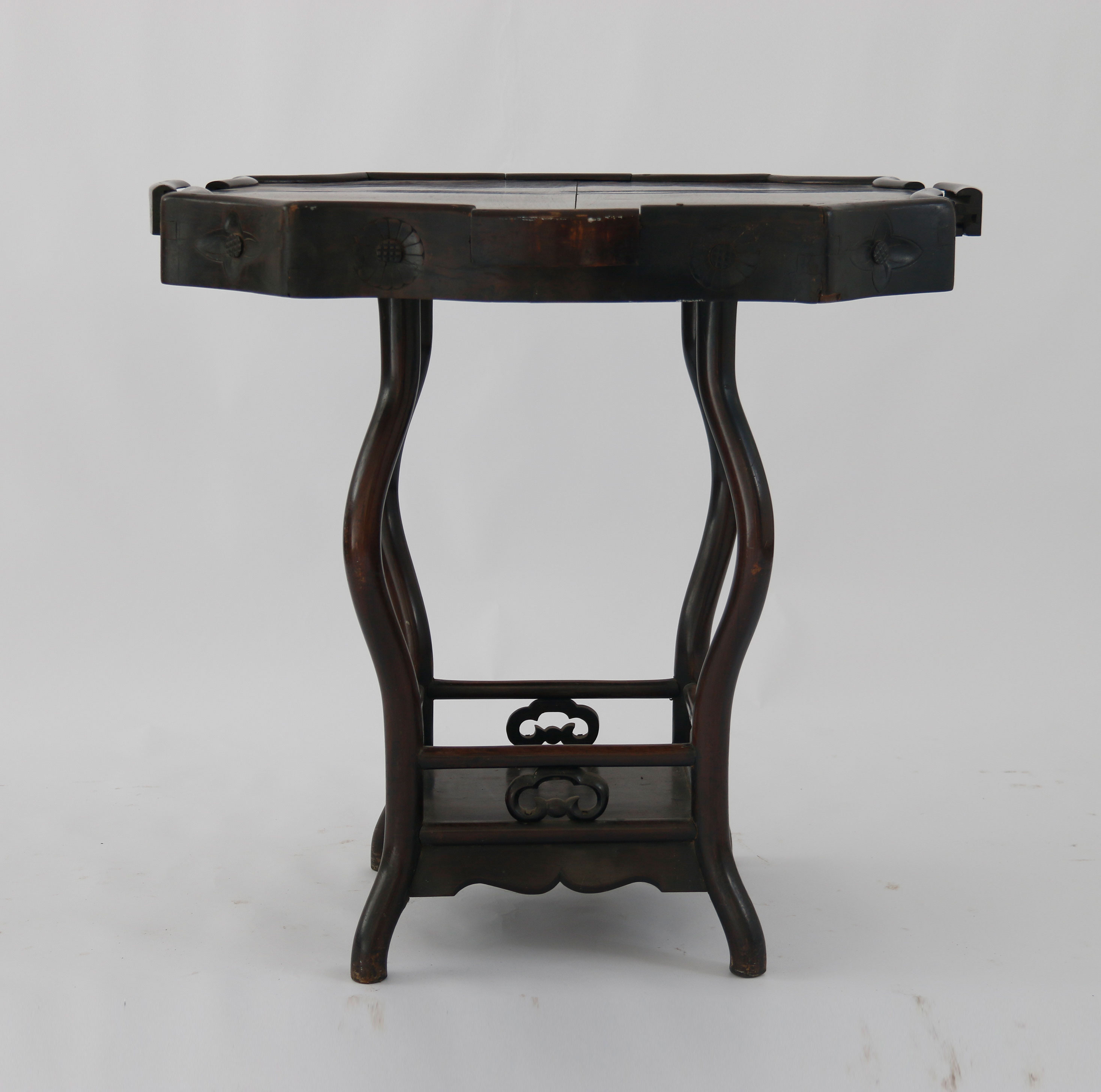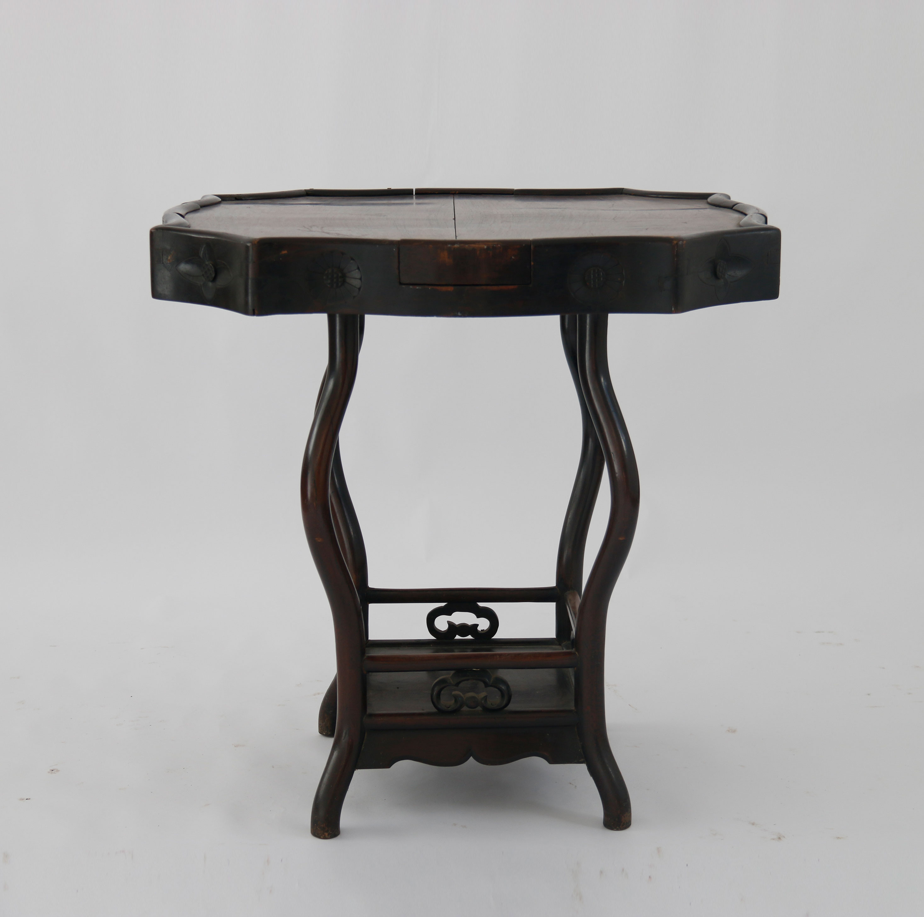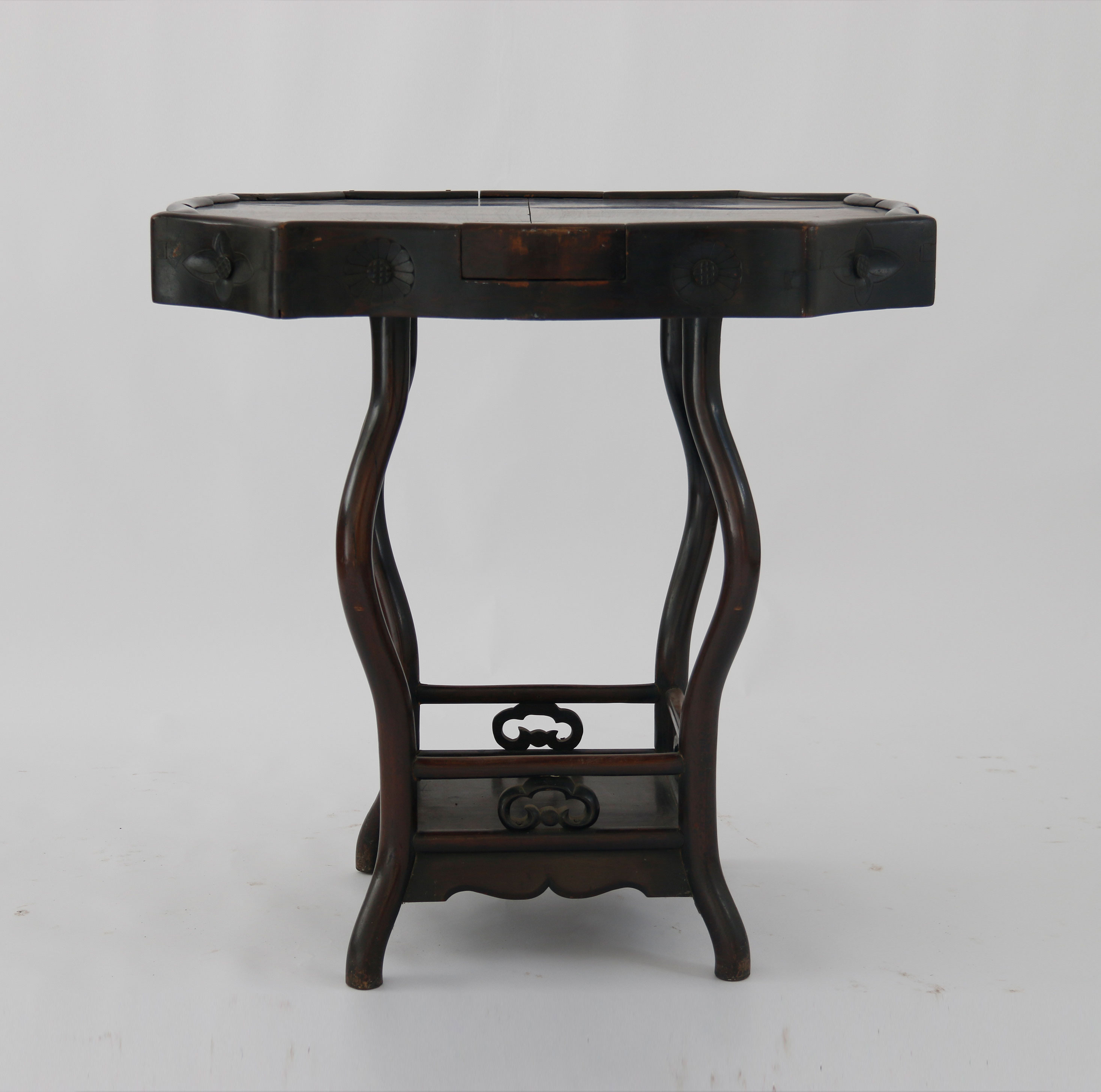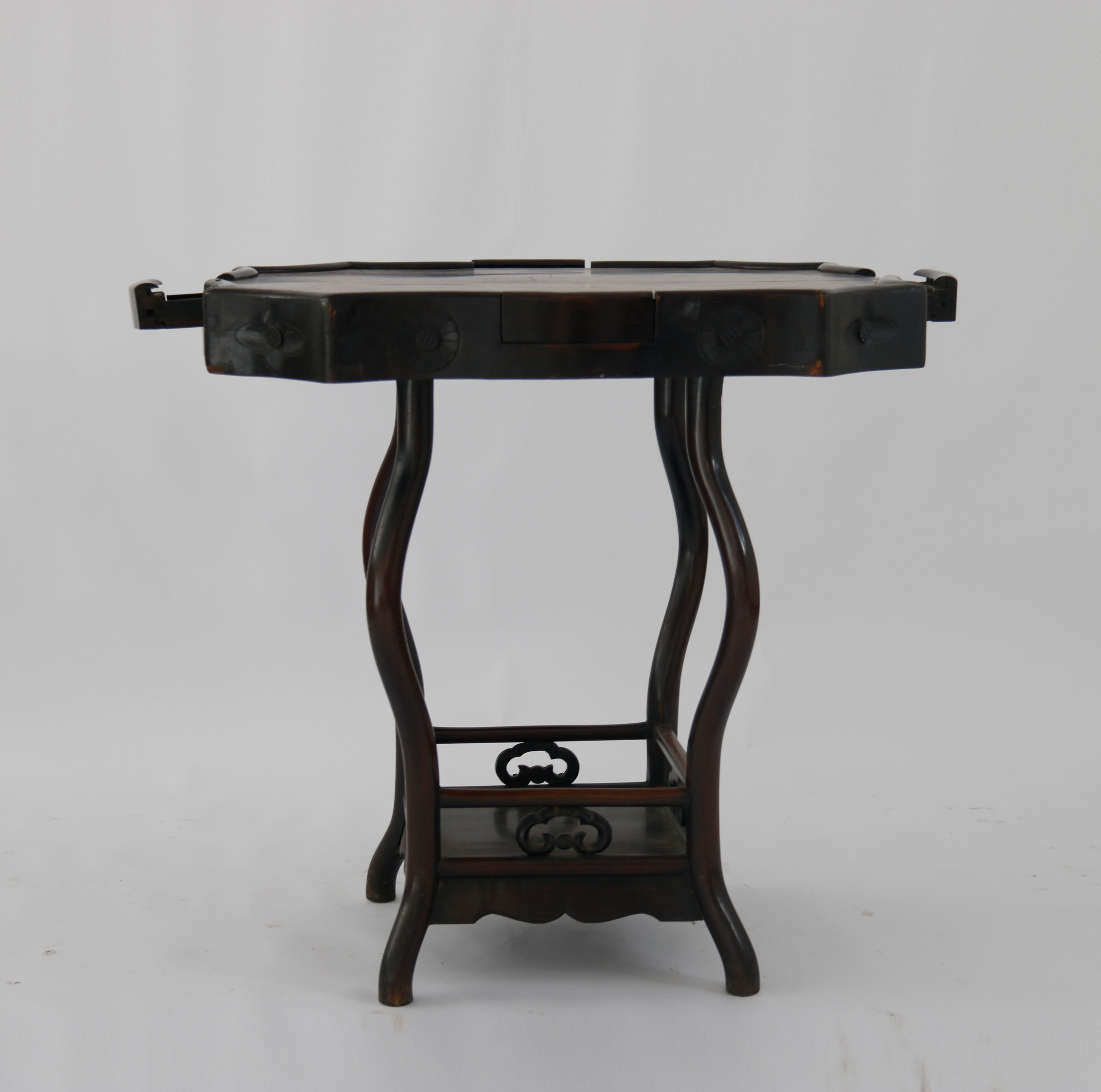 年代:中华民国;尺寸:通宽80.7cm,高82cm。台面为八角形,台沿高起作栏,台侧有四抽屉及雕花。下为曲折形座架,四足端外撇。座架下部为方形,有层板,上有镂空云头纹。