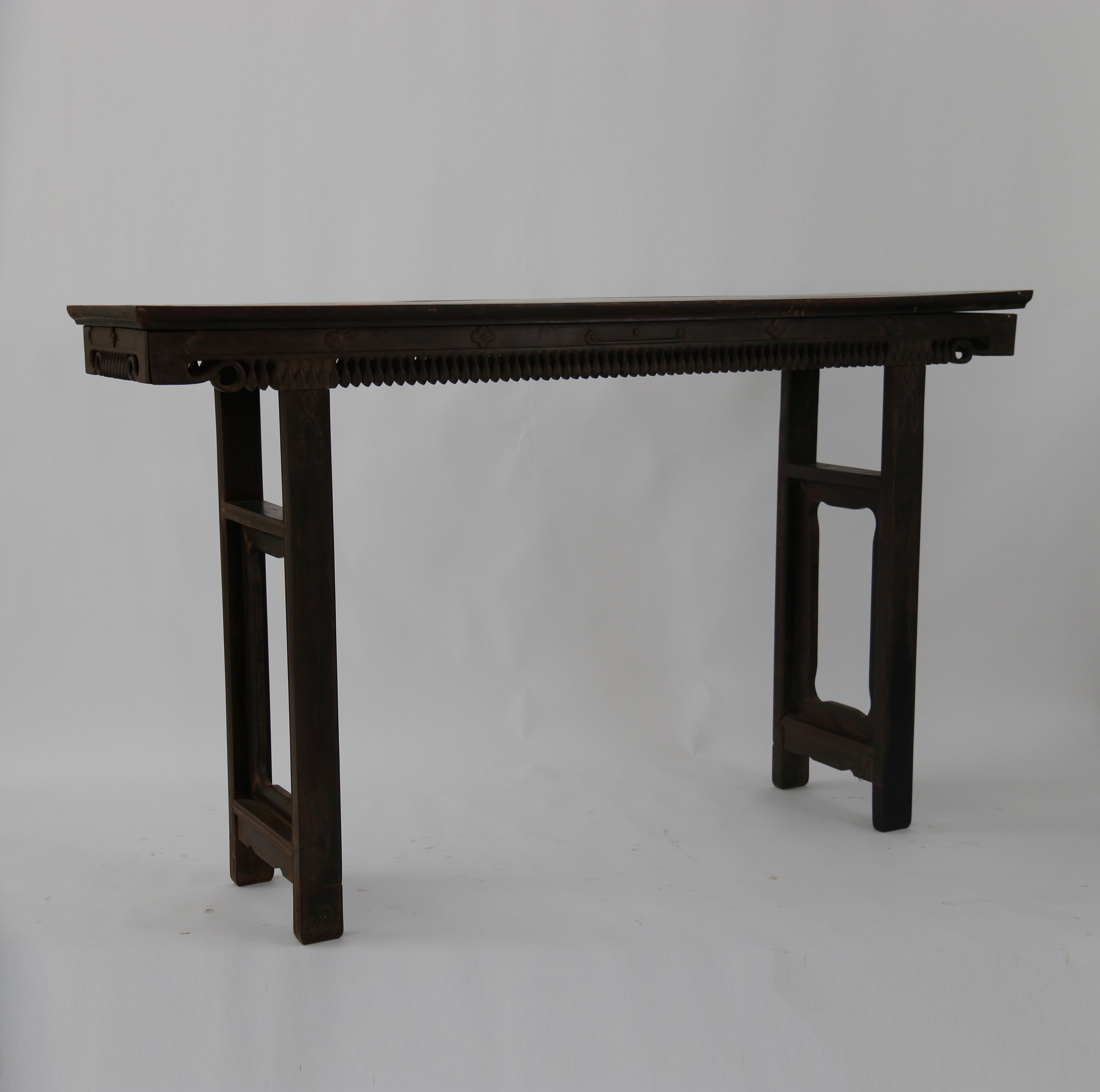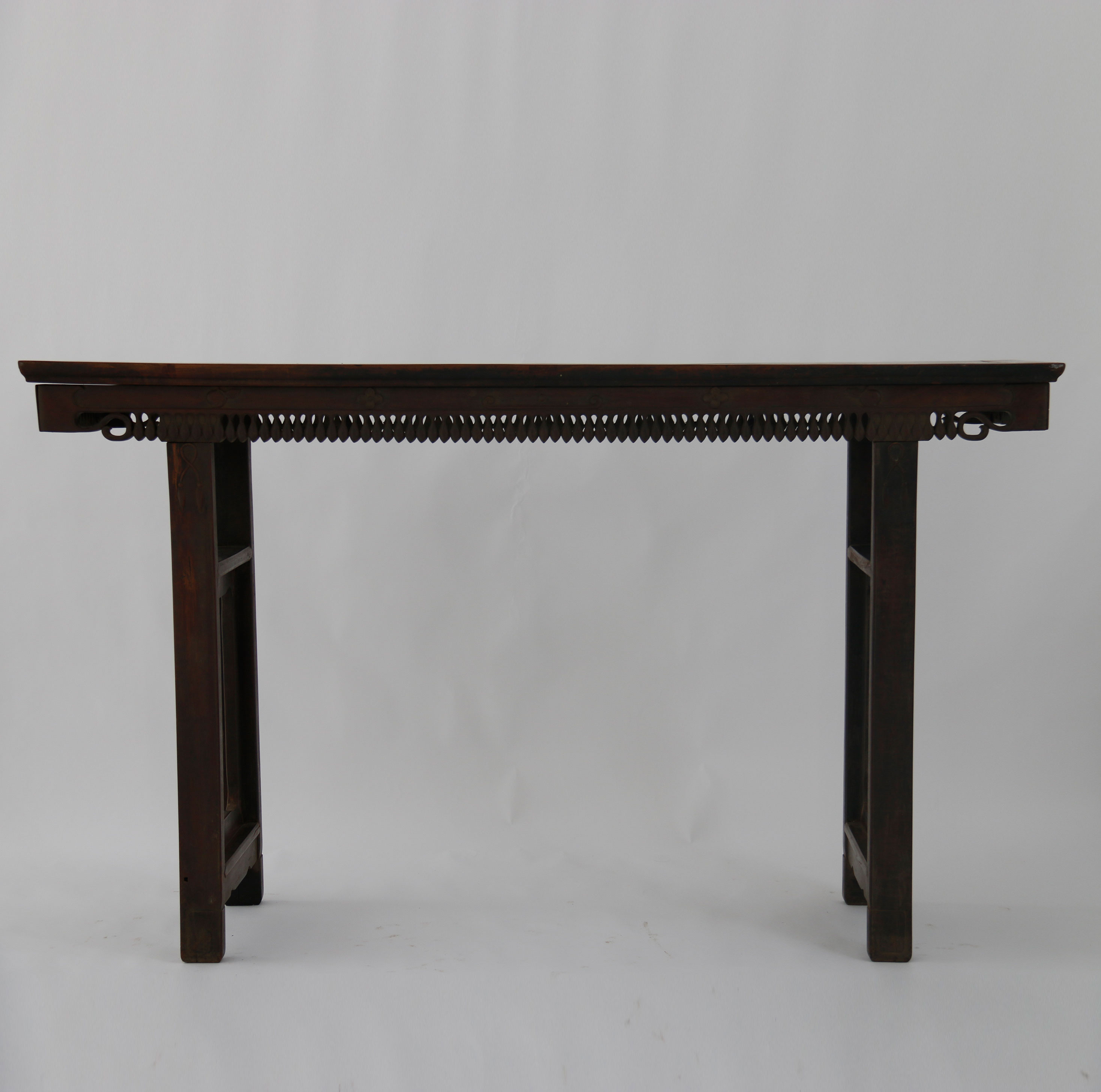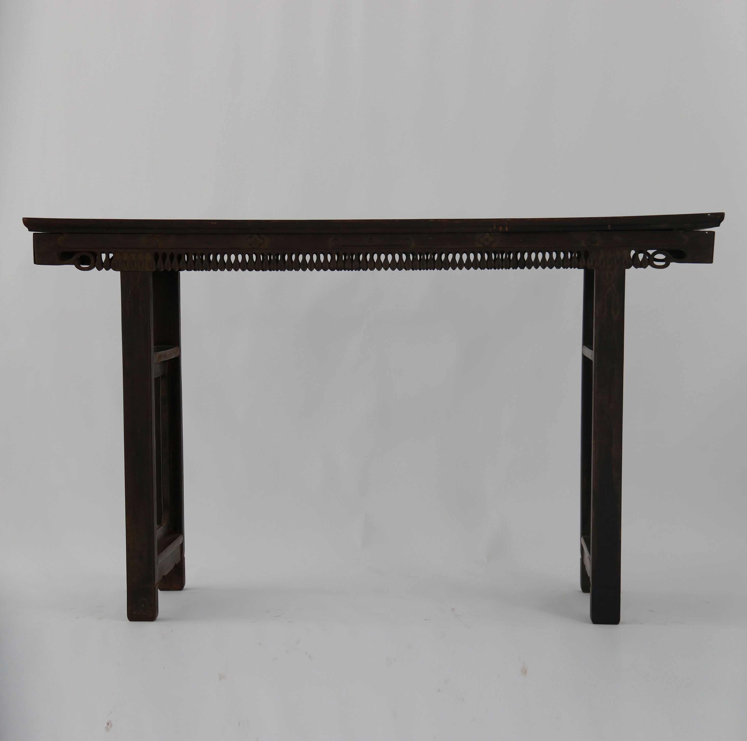 年代:中华民国;尺寸:长174.4cm,宽42cm,高104.5cm。酸枝木制作。案面较长,呈长方形。案面侧板镂空叶纹。下面两端为支架,各用两根长条木及两根横杠组成。