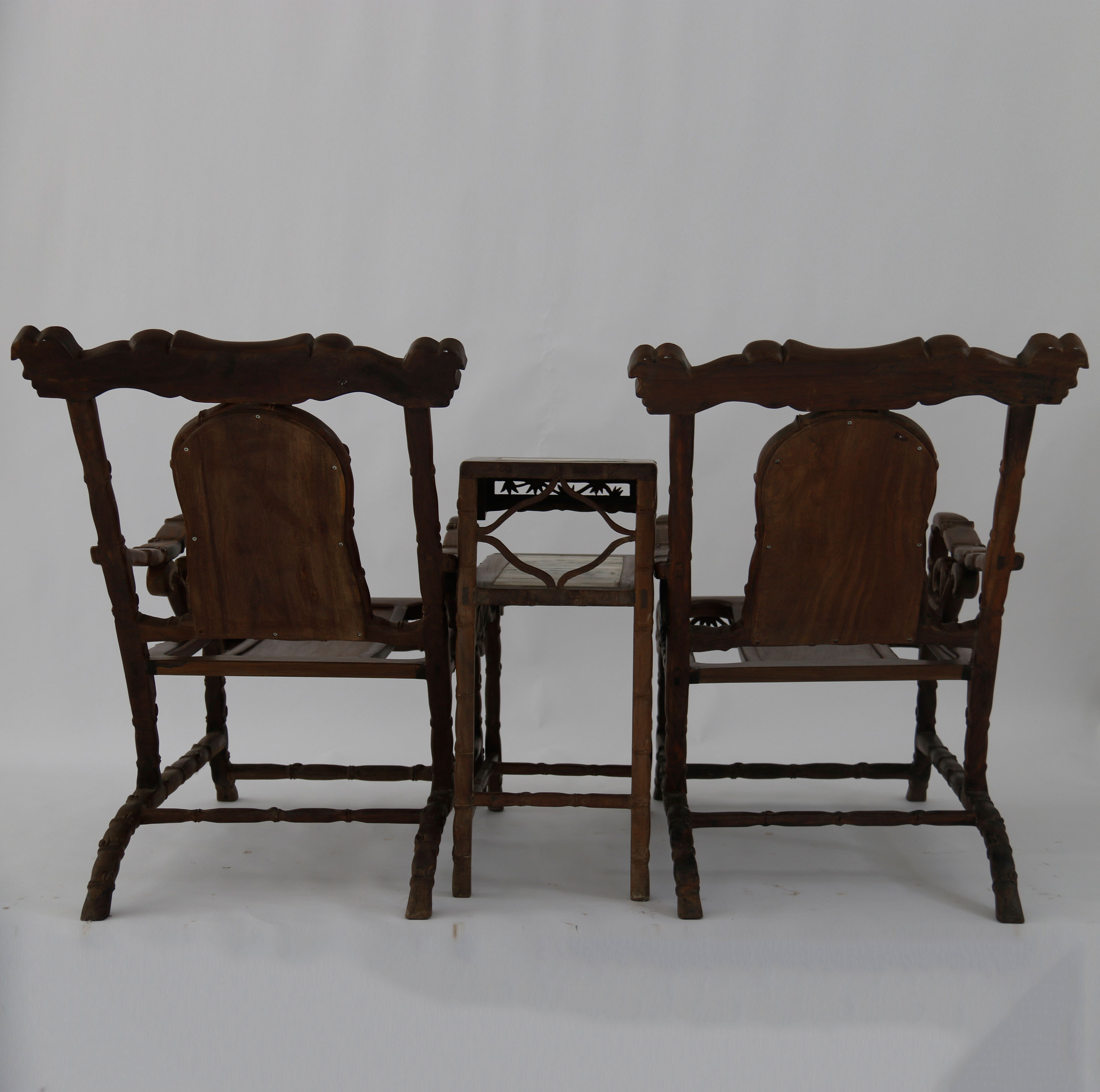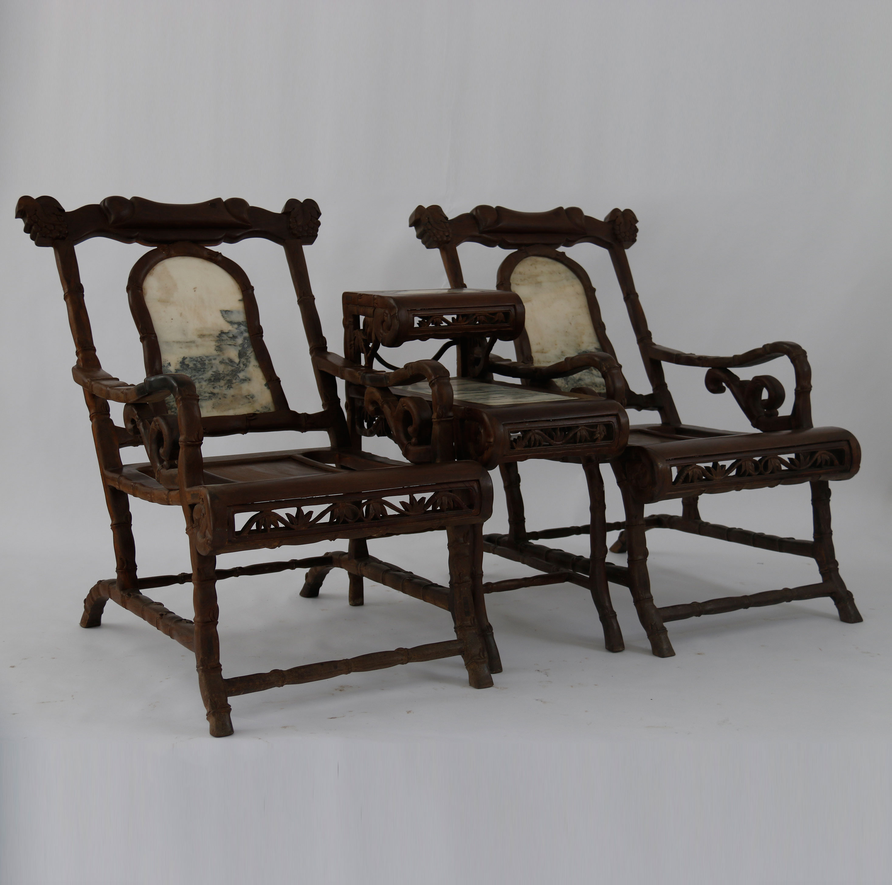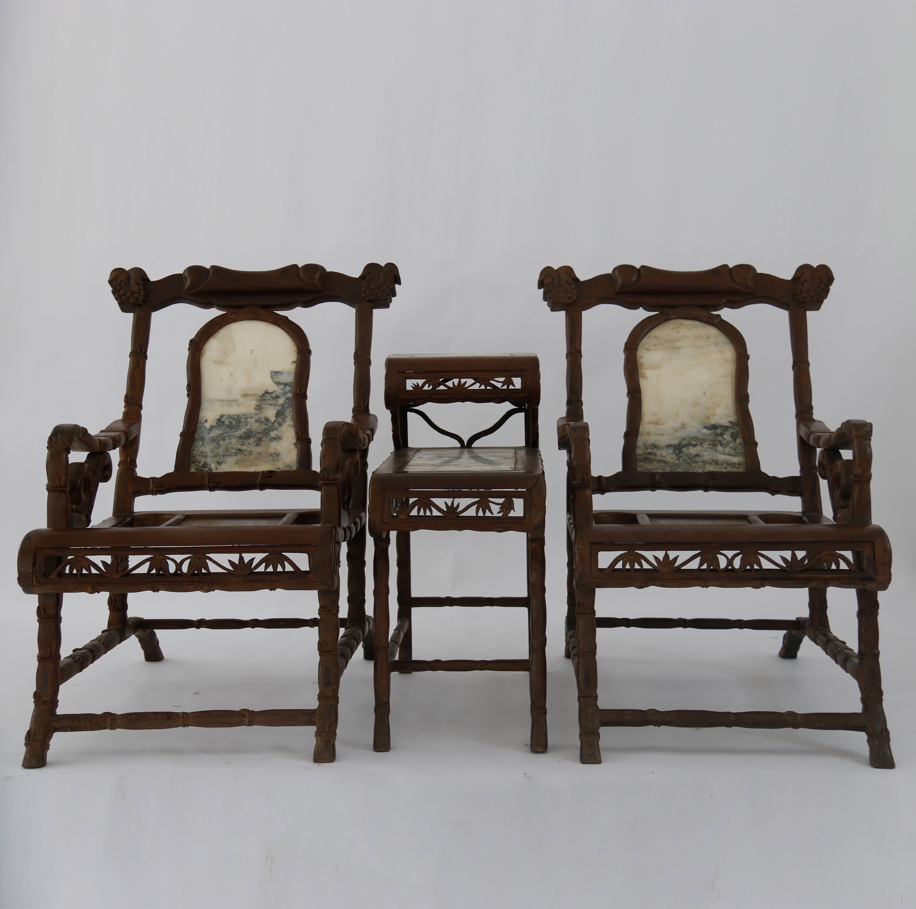 年代:清;尺寸:趟椅进深57.5cm,宽89cm,通高95cm。酸枝木和云石板制作,有二椅及一几。椅有靠背及扶手,靠背中间镶嵌云石板。高低几两个面亦镶嵌石板。椅、几下为四足,有连杠固定。椅座下侧及几面下侧均镂雕花卉。