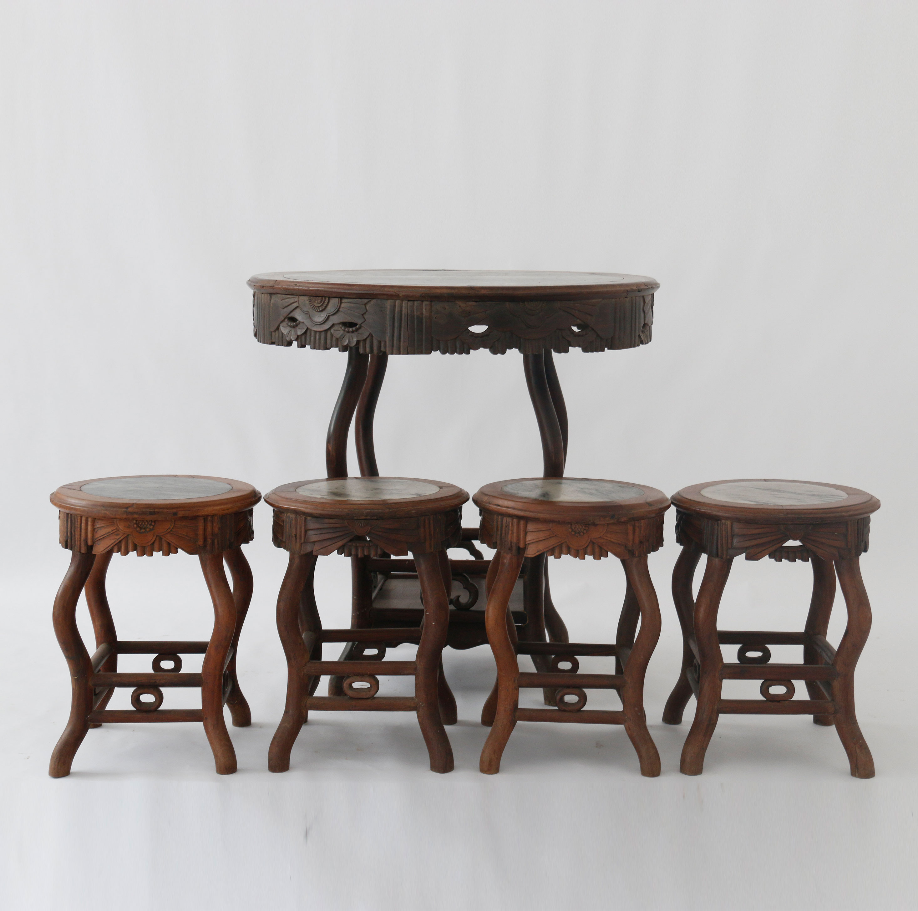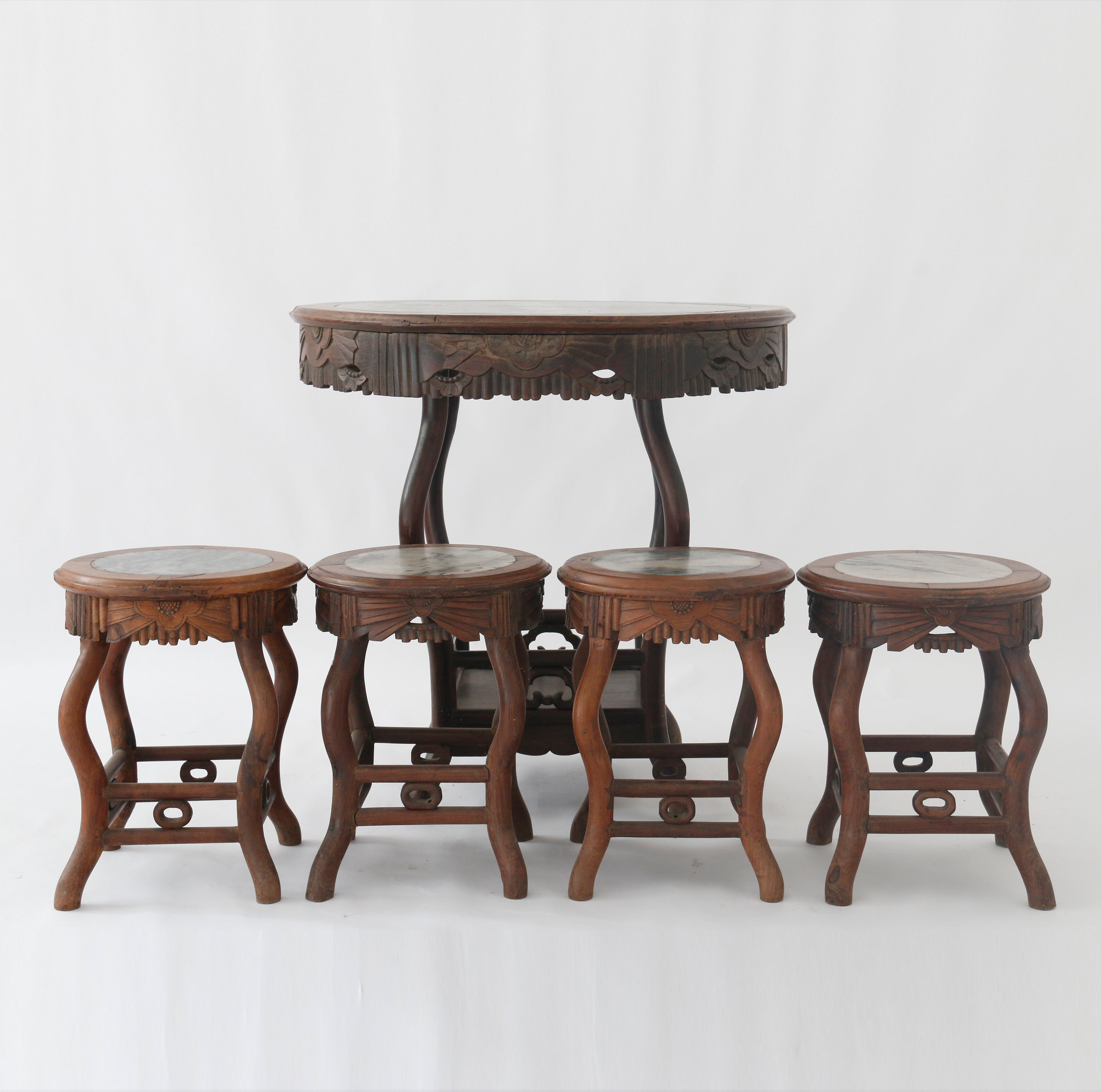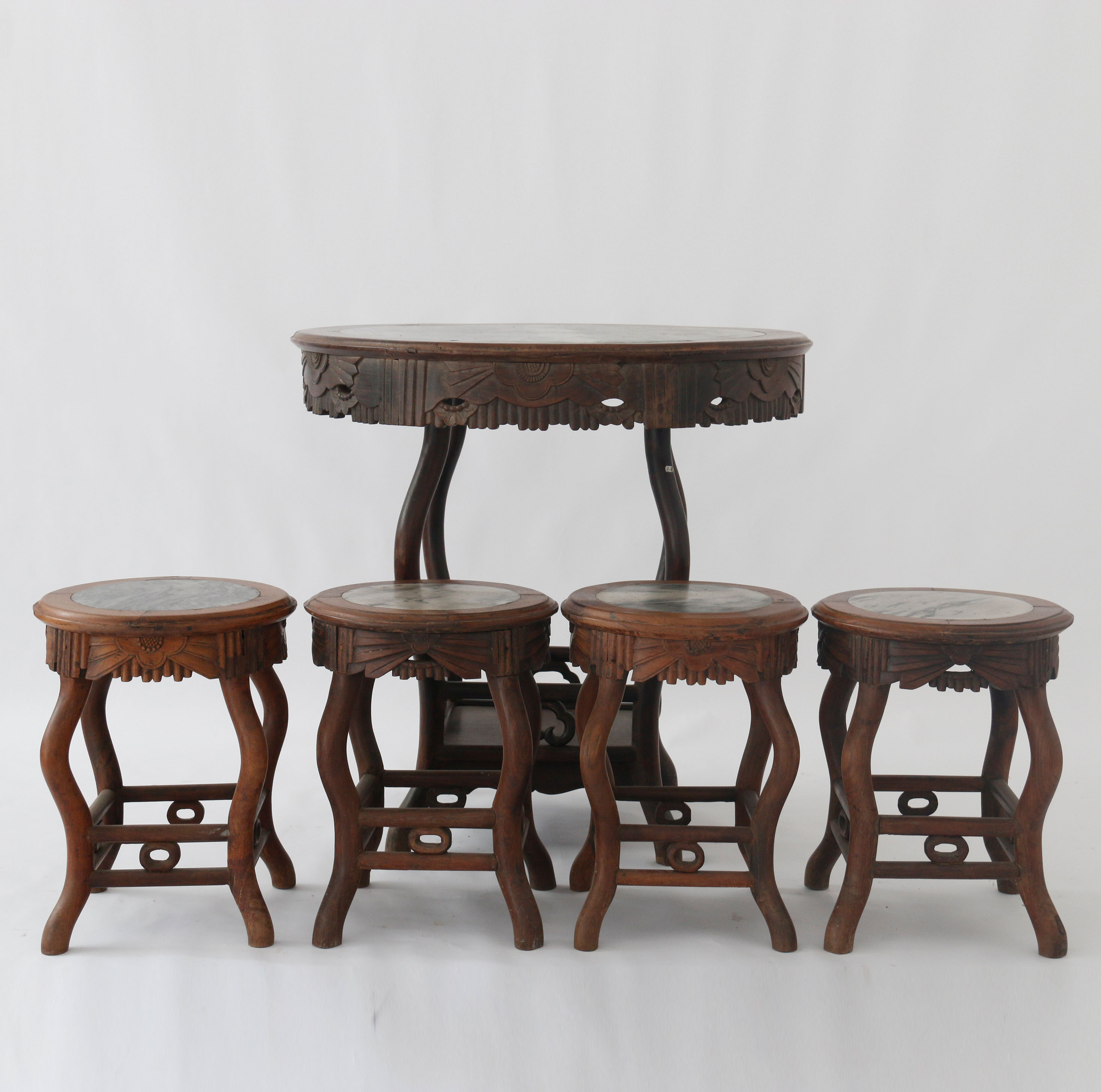 年代:清末;尺寸:圆台直径81cm,高80cm;凳面直径34.5cm,高45.5cm。酸枝木和云石板制作,有一台及四凳。台、凳均作圆面,中间嵌石板。下为弯曲形架座,四足外撇。面下沿雕刻花卉。