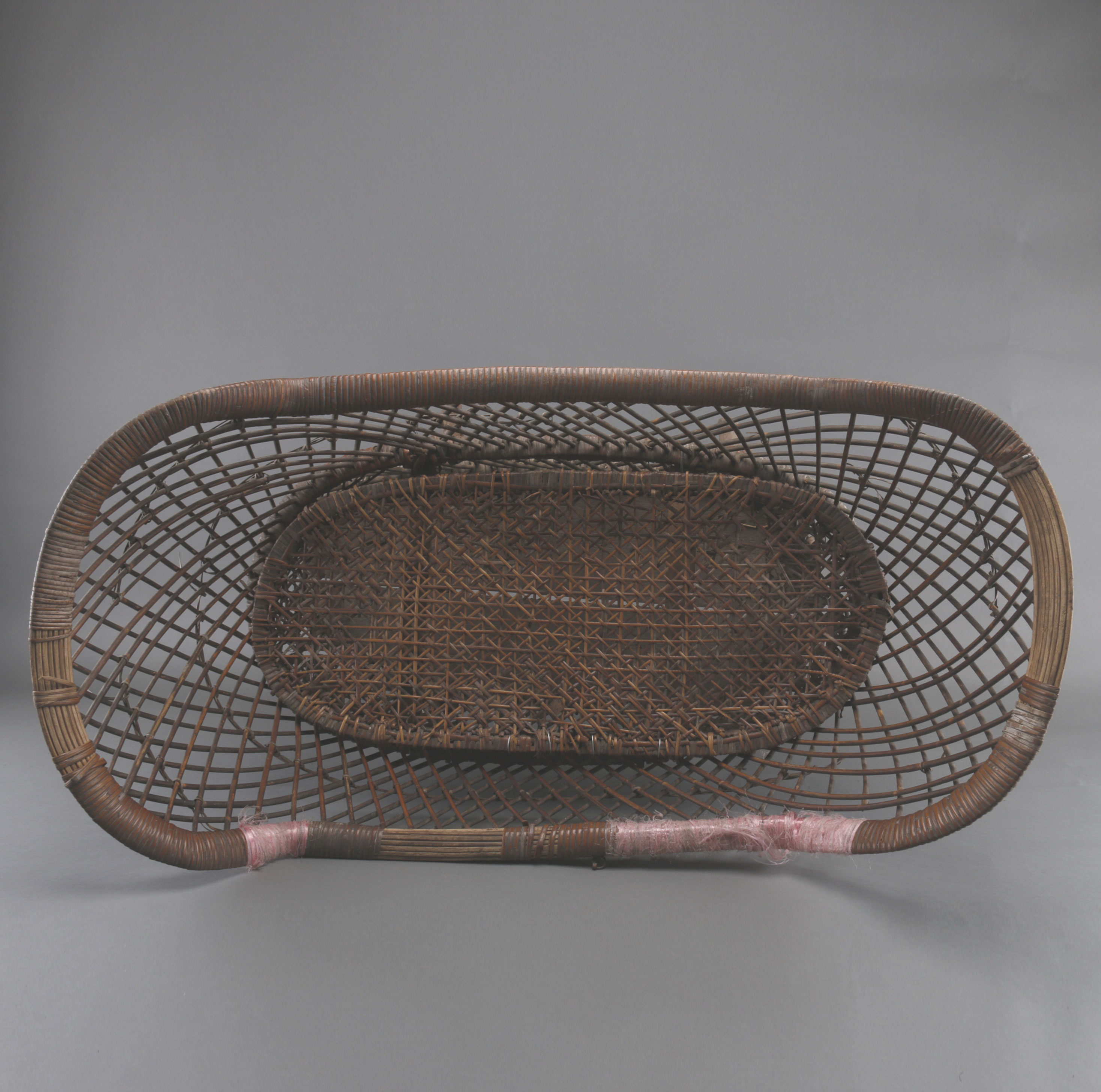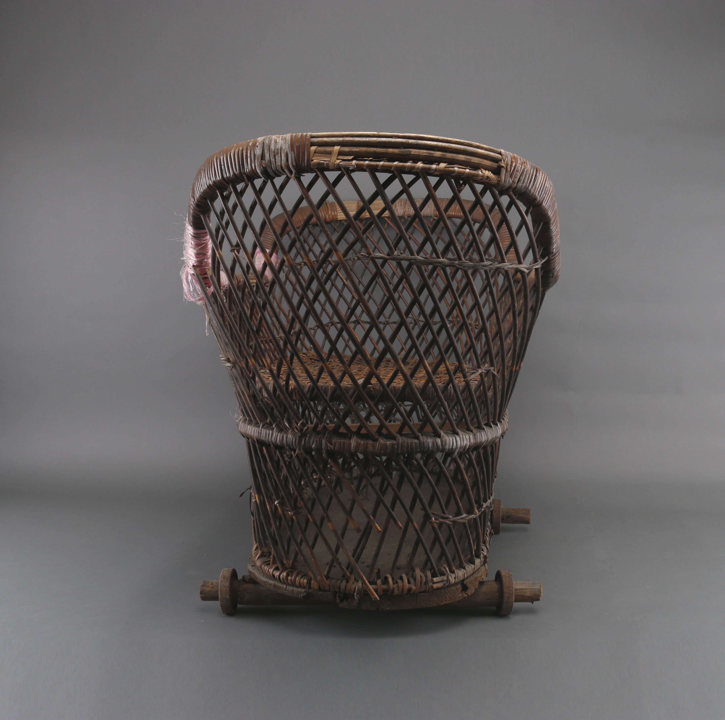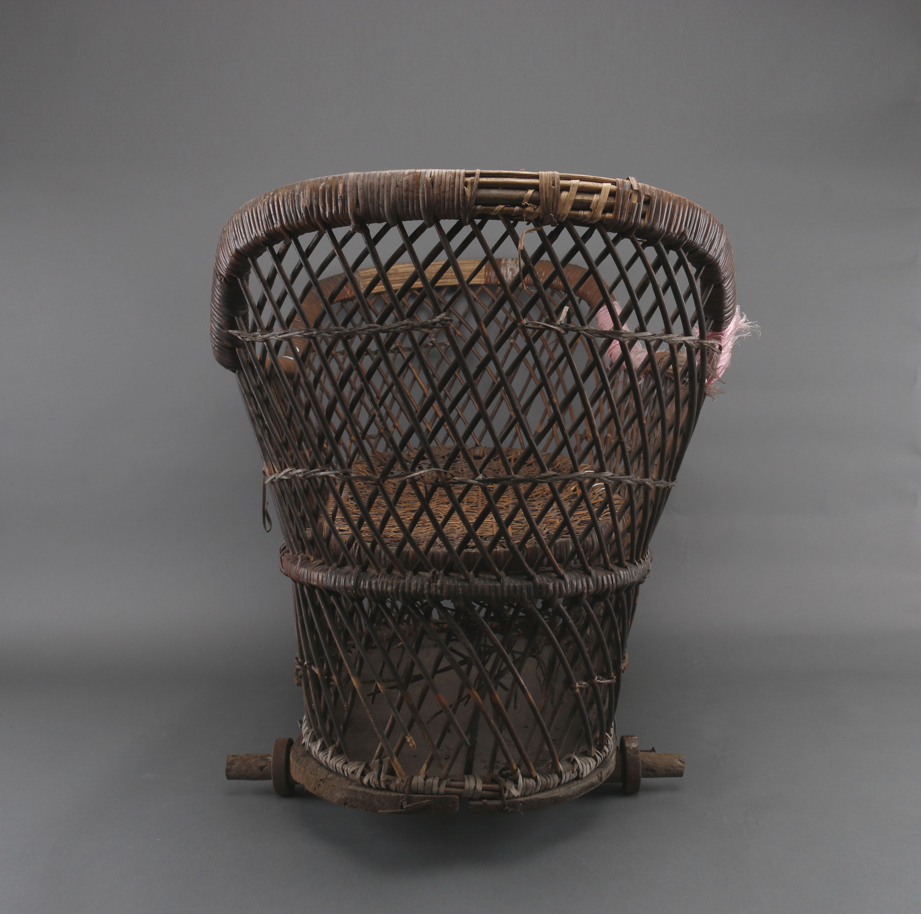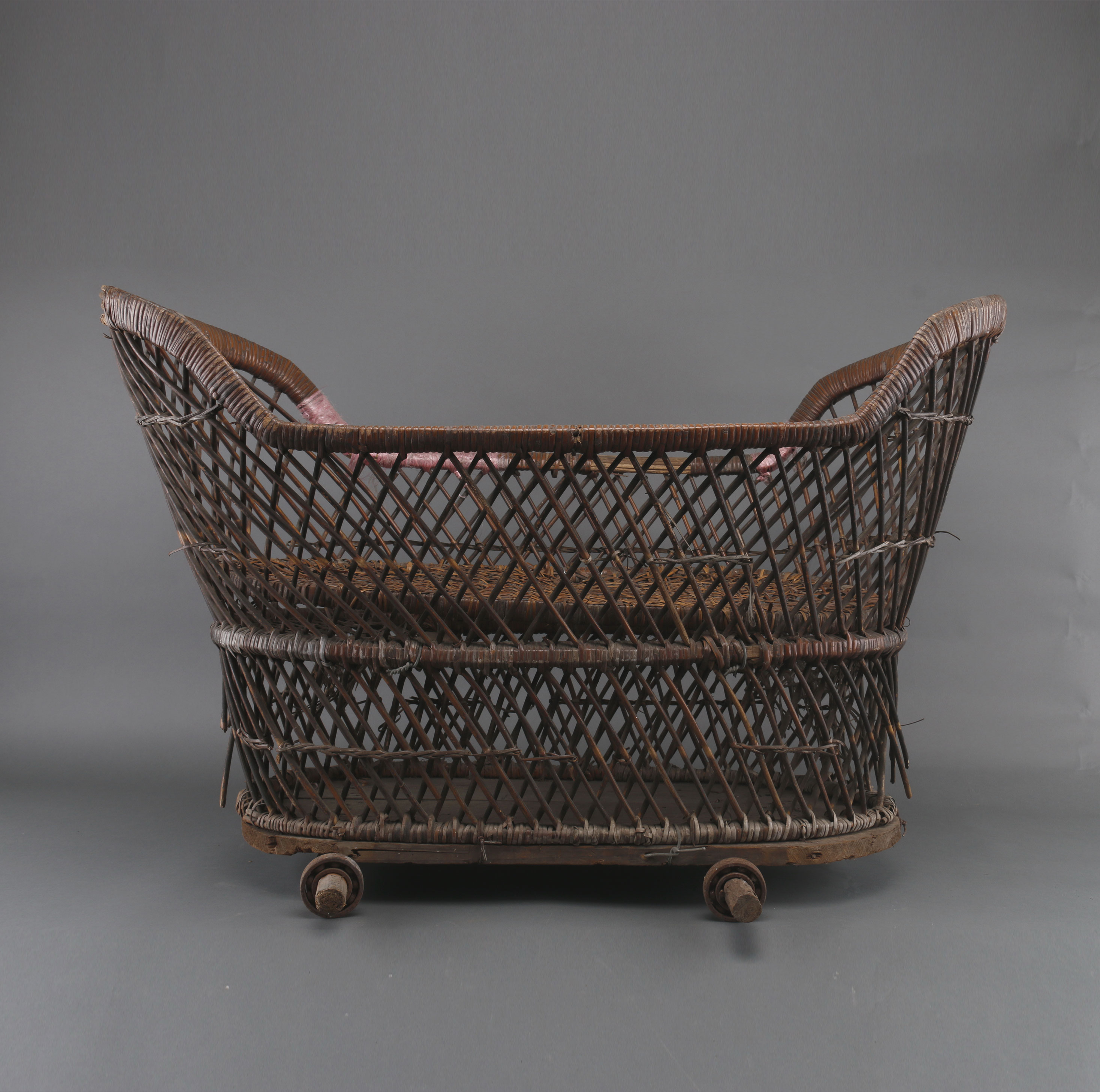 年代:中华民国;尺寸:藤编而成。上为篮形,两端高,中间低,分两层。下有四个小轮,用两根圆木串成。