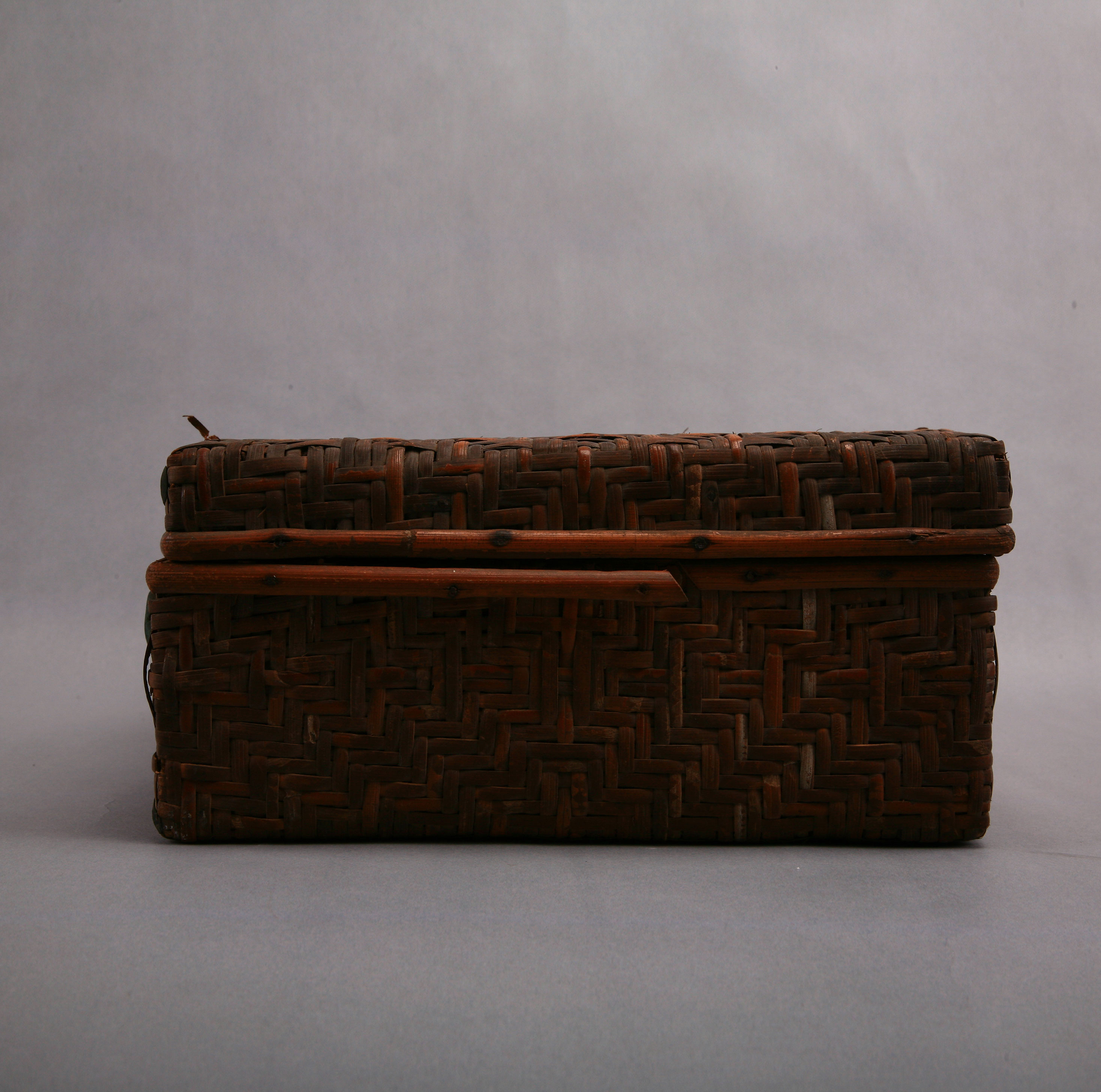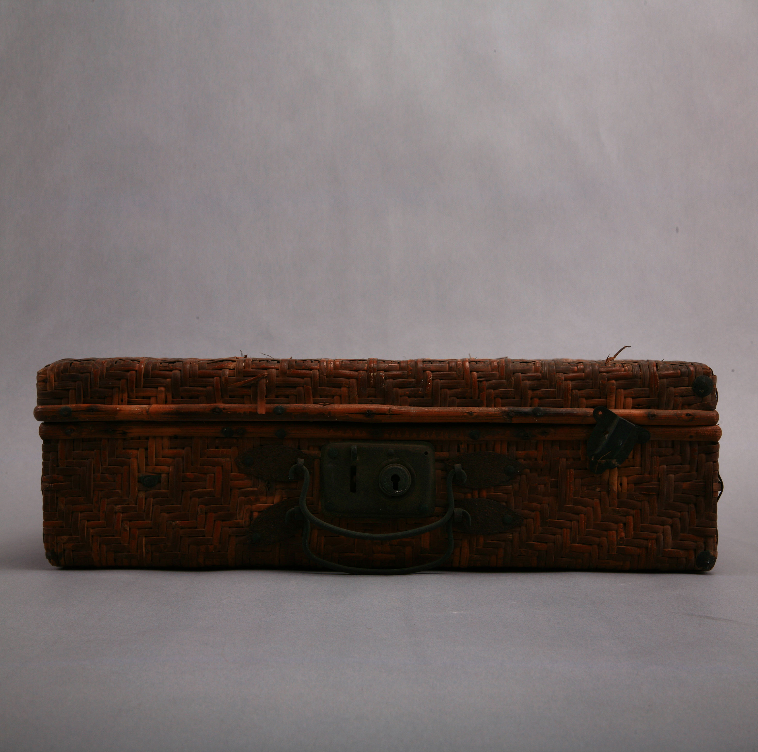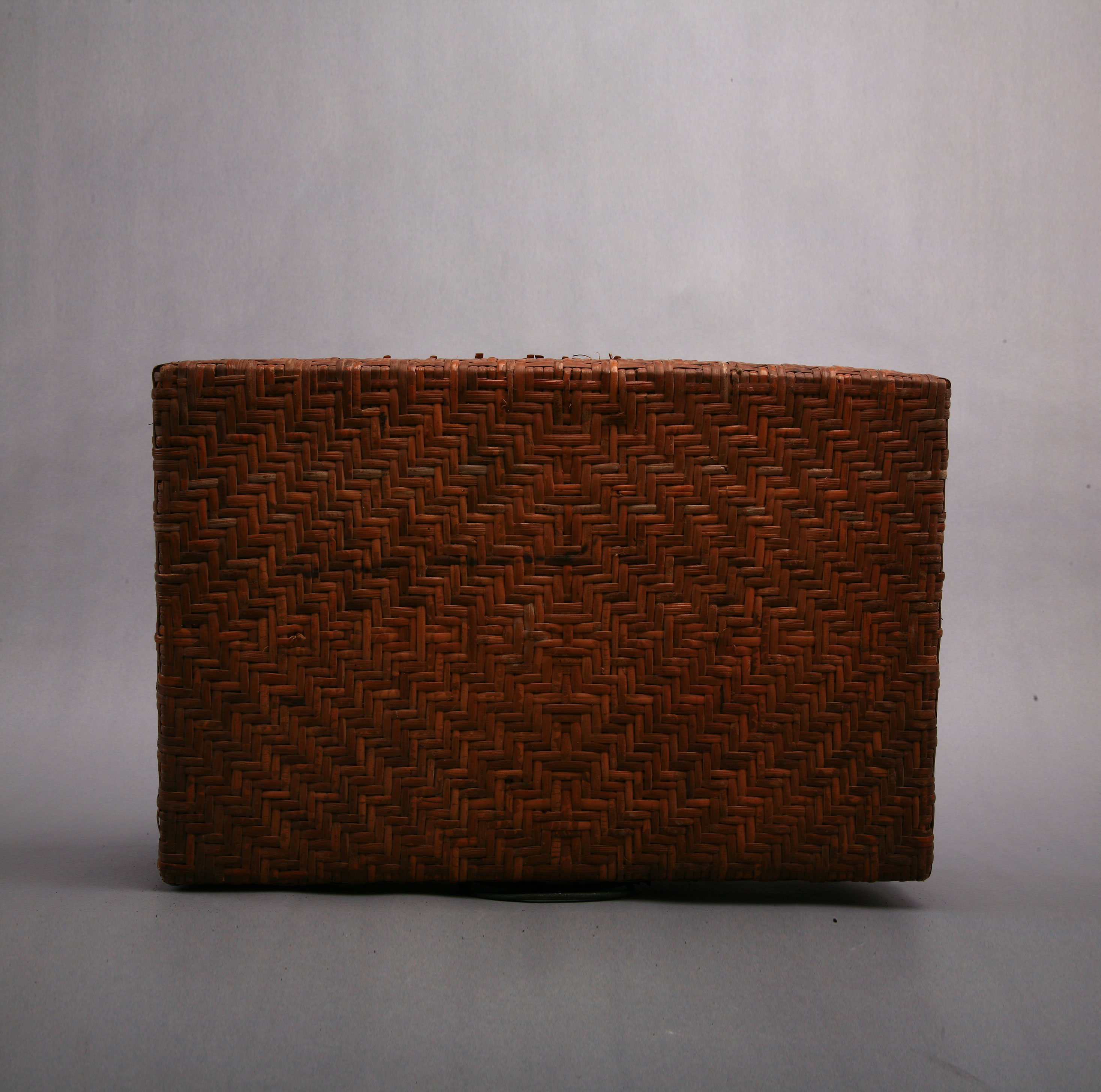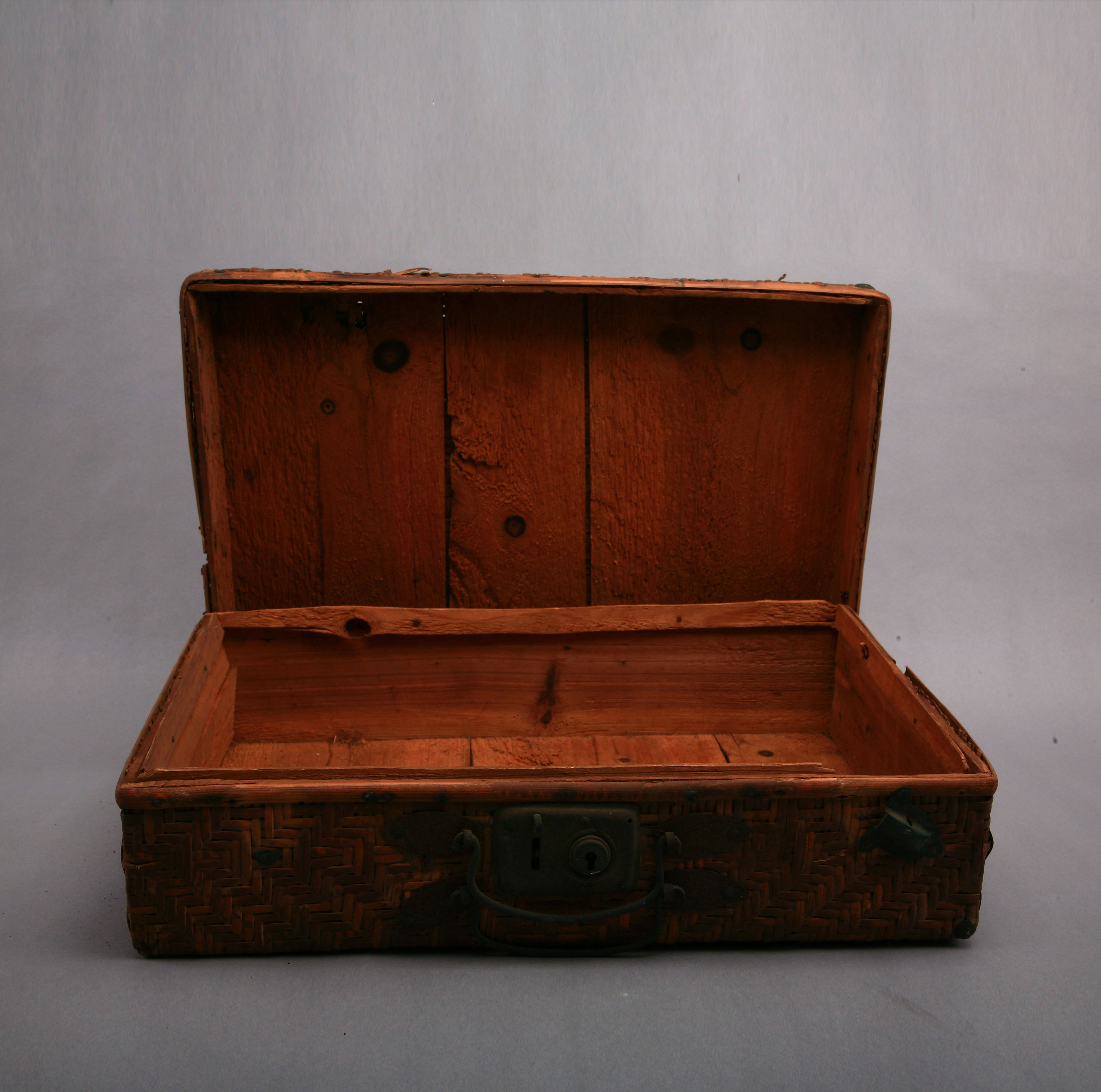 年代:中华民国;尺寸:长43cm,宽28cm,高13cm。长方形,藤编包木,正面有锁眼及手提环耳。是开平华侨归乡时所用的一种轻便箱子。