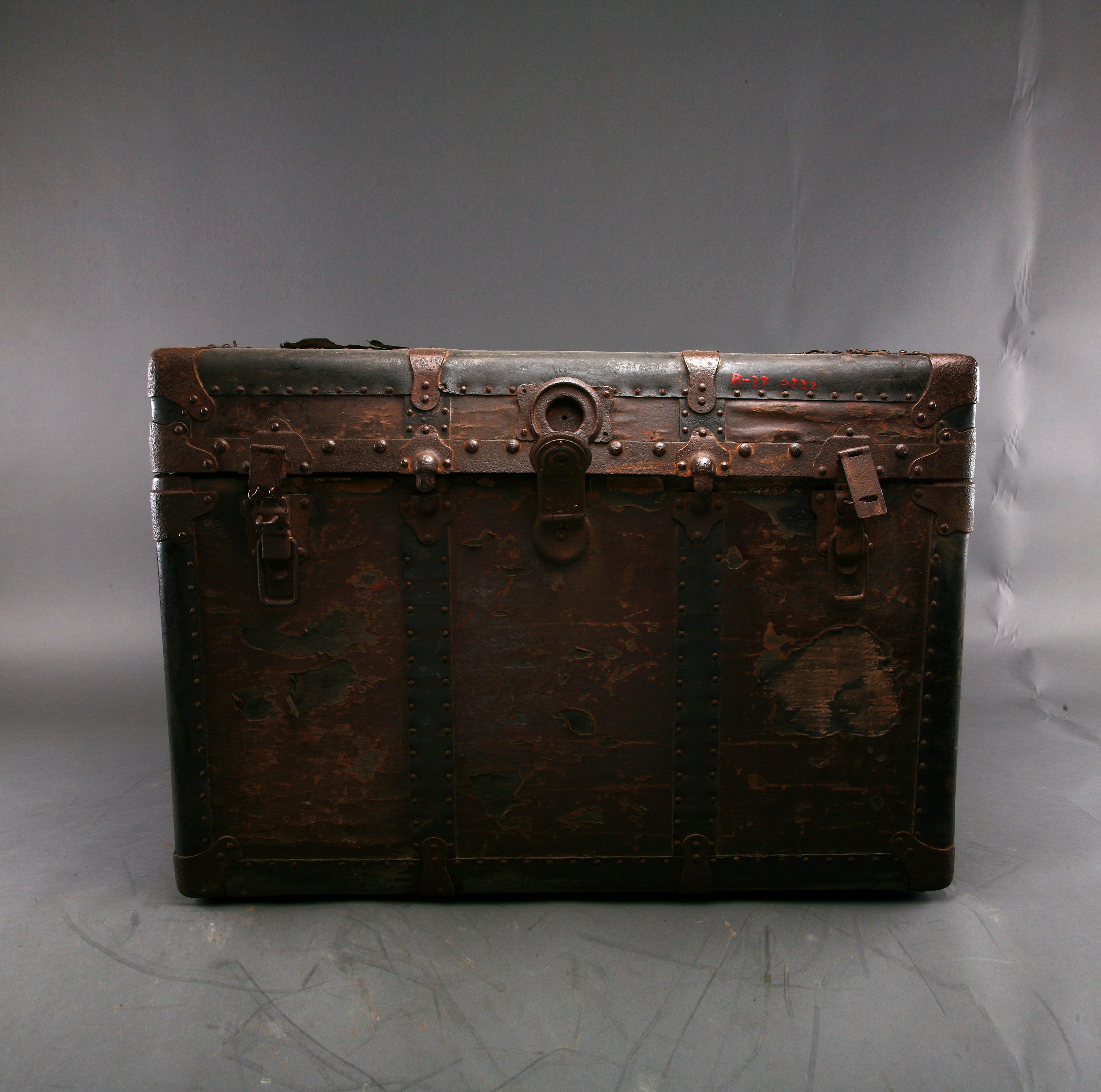 年代:20世纪上半叶;尺寸:长81.5cm,宽53cm,高54cm。长方形。用铁皮包裹木箱,器表有许多金属铆丁,并见一个锁眼、二个锁扣。皮质已略损。 “金山”是早期五邑华侨对美国的俗称。当年,侨居美国的华人回国时,怕水路远、时间长,旅途舟车劳顿,财物散失,故都自制或购买大箱,把金银细软等装进箱子运回家中,人们习惯称这类箱子为“金山箱”。它是当时华侨“衣锦还乡”的标志物之一。