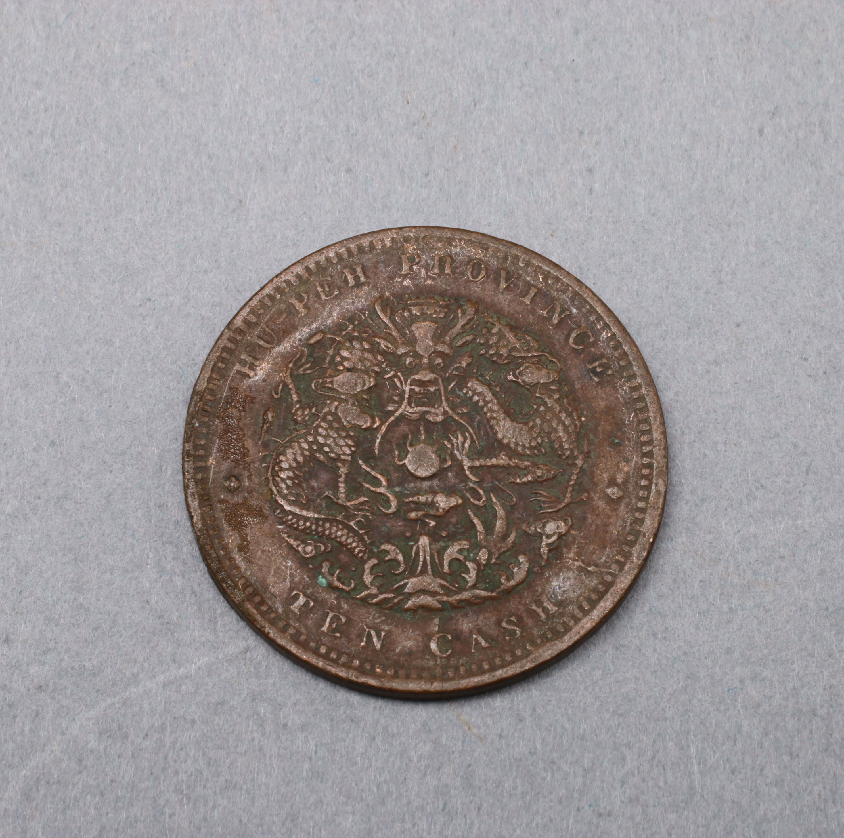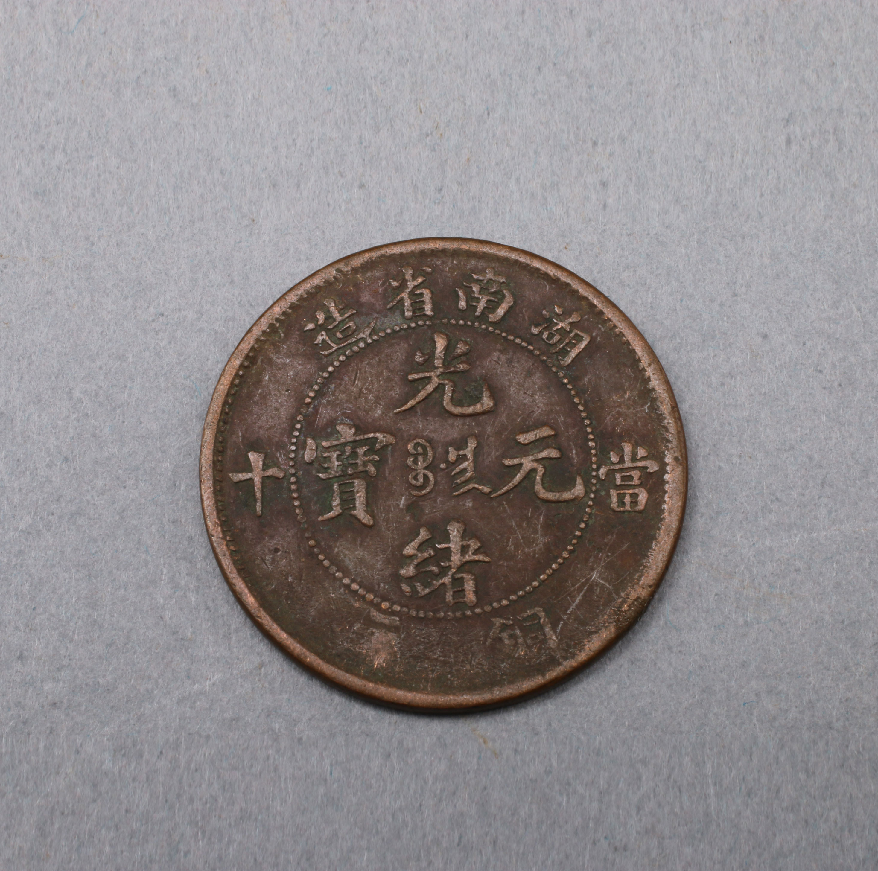 年代:清;尺寸:直径2.8cm,厚0.18cm。共12枚。正面中央铸铭“光绪元宝”,上边缘为铸造地:湖北省或湖南省,下边缘为“当十”,或“每元当制钱十文”,或“当铜元十”。并见满文。