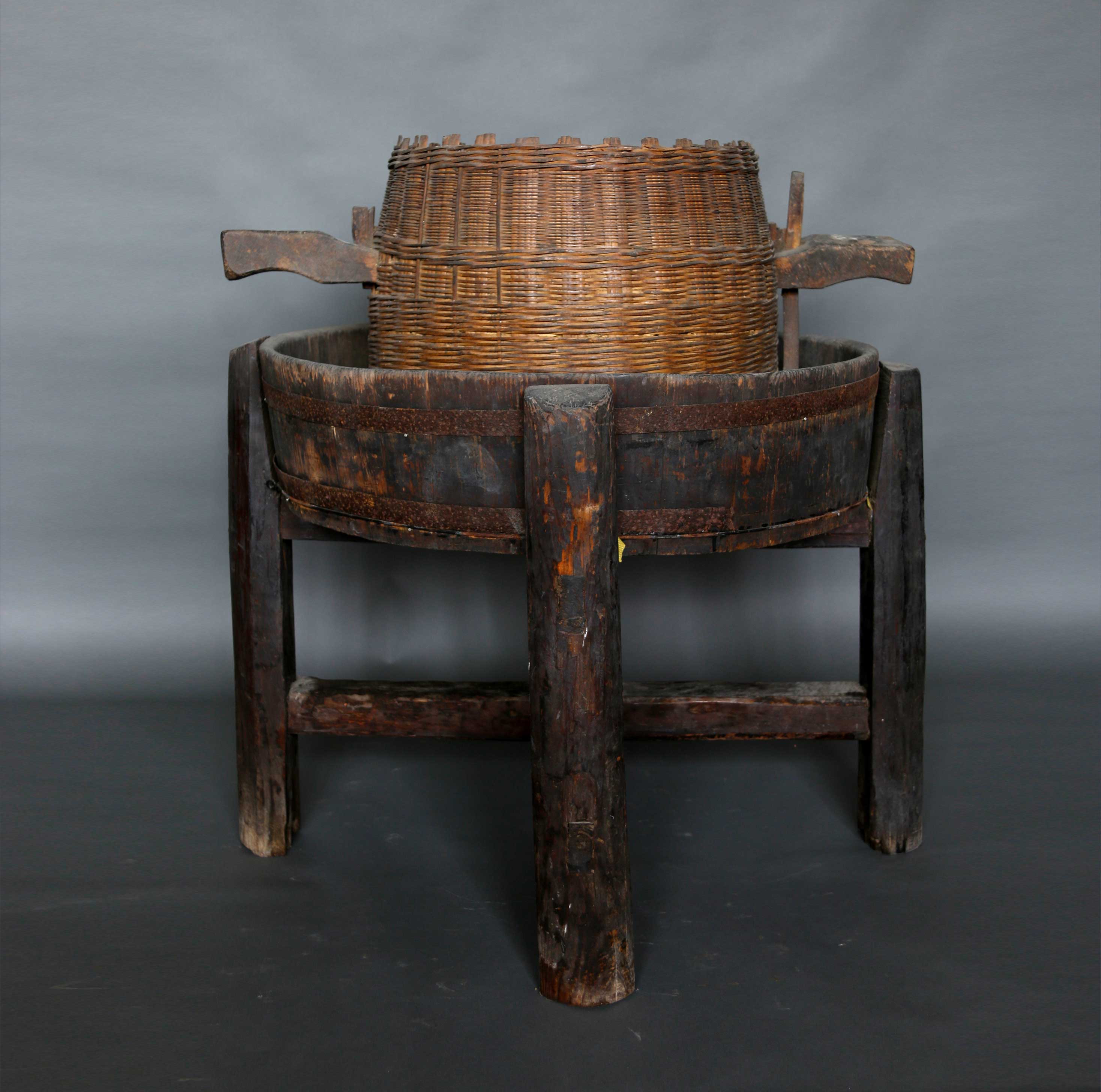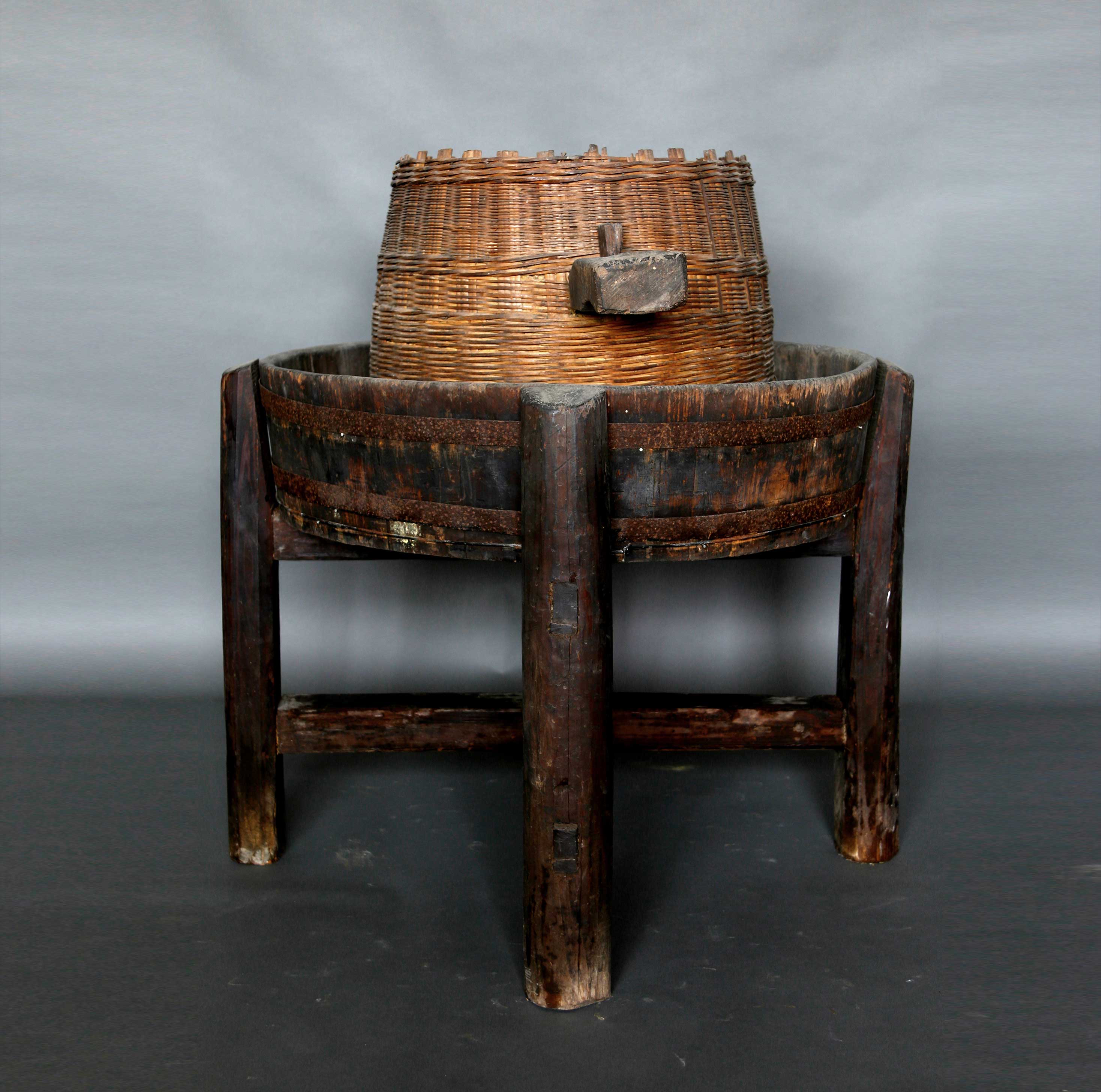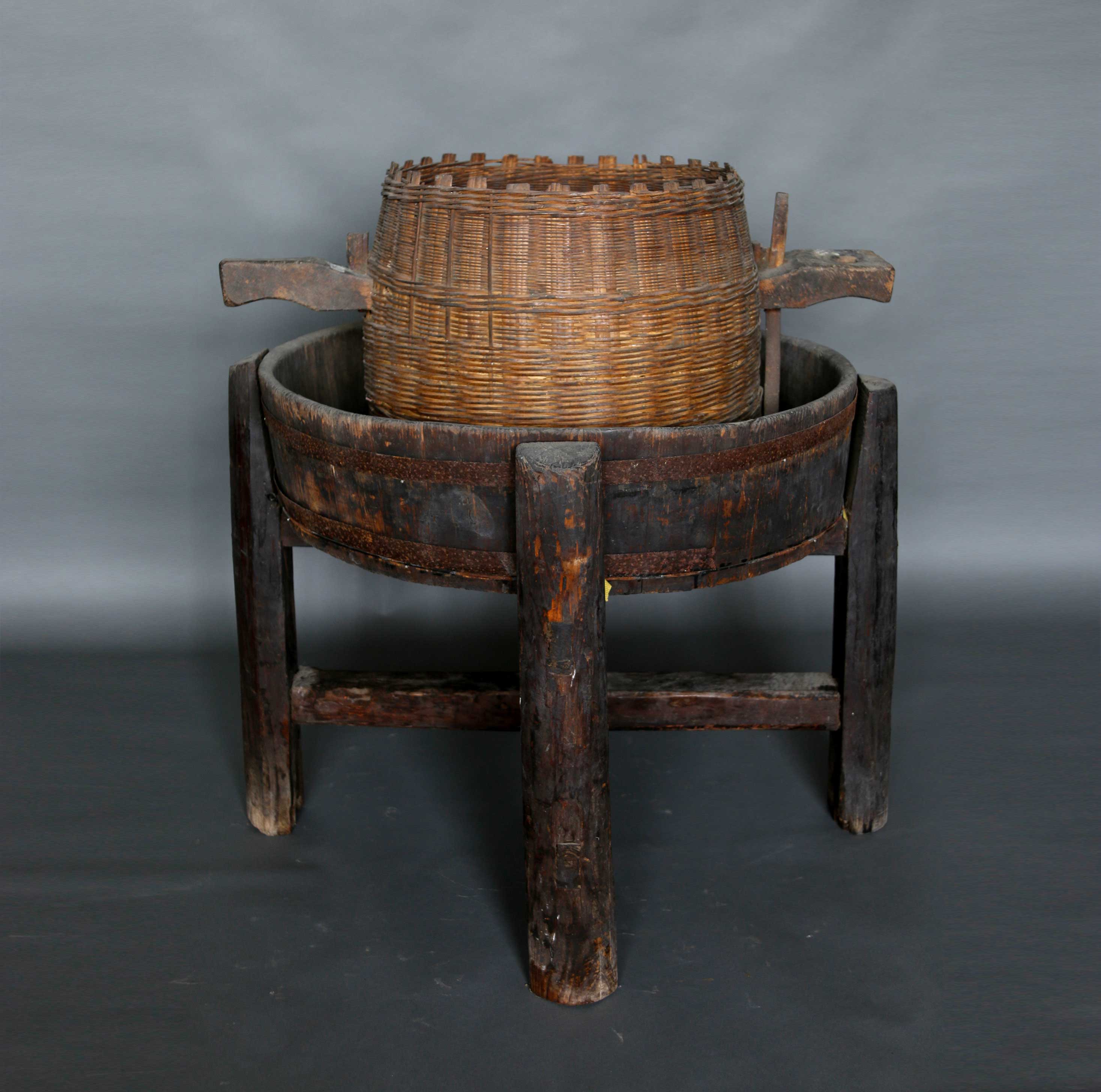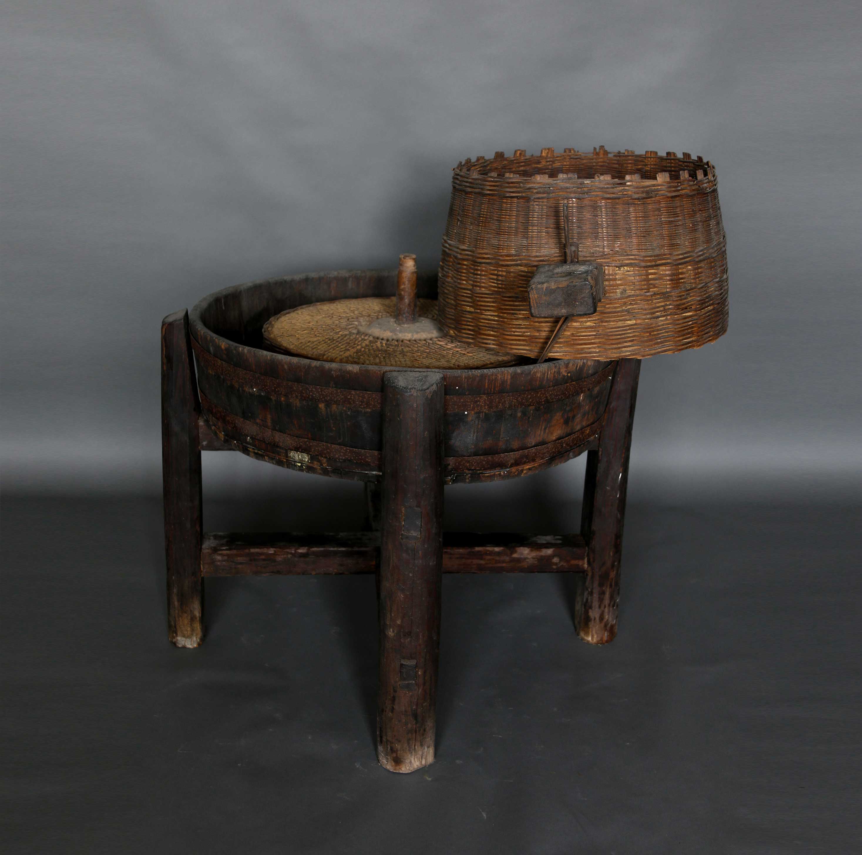 年代:20世纪50年代;尺寸:盘架径73cm,高85cm;磨直径40cm。上为石制谷磨,外裹以藤编,两侧连结木把。下为木盘架座。盘用金属箍成。十字木架,四条直足。