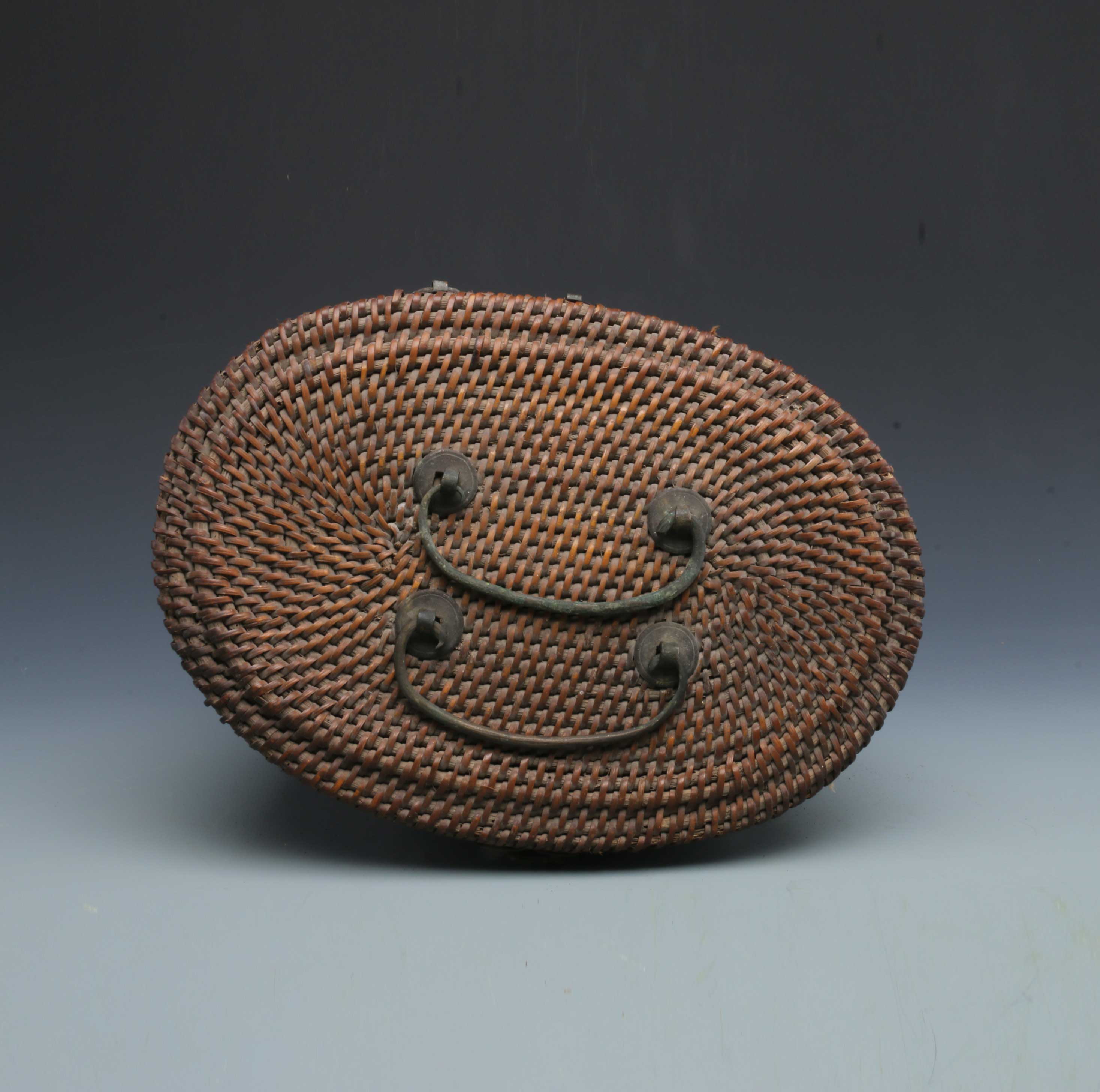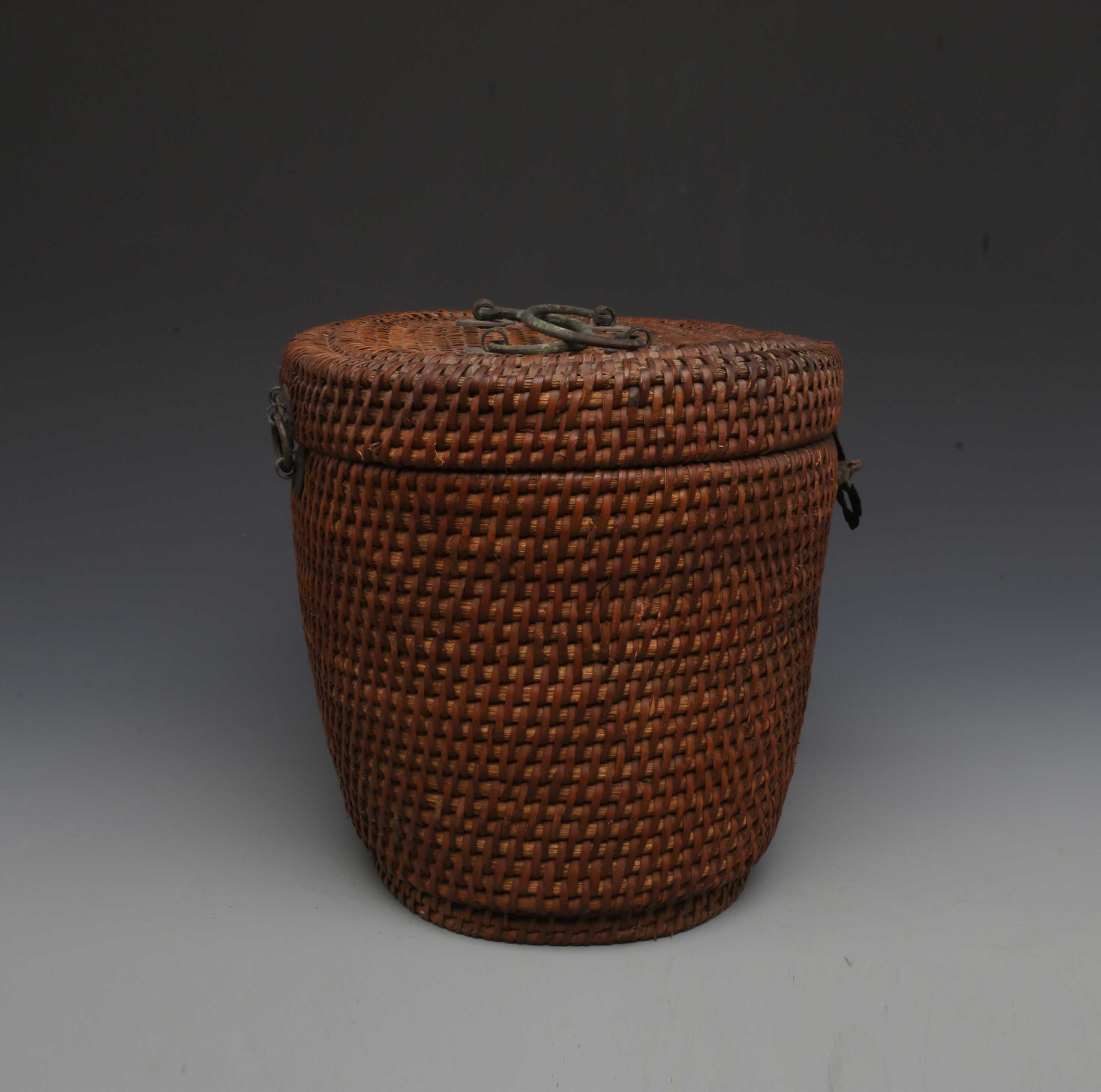 年代:中华民国;尺寸:长25.4cm,宽17.7cm,高17.5cm。藤编制。盖顶有环耳提手。斜收深腹,平底。盖与箩身上腹有铜扣。内装瓷茶壶,可以保暖。