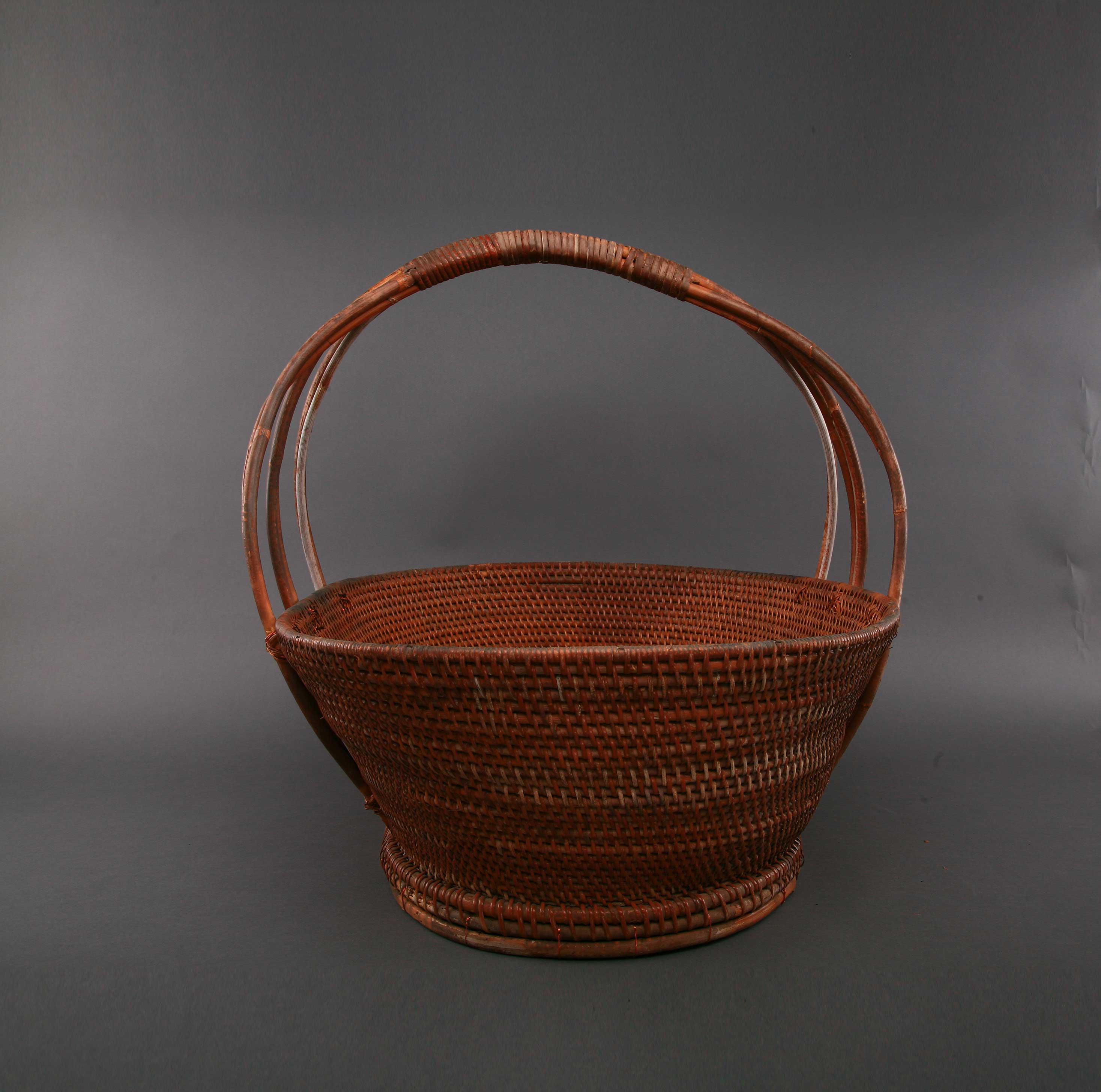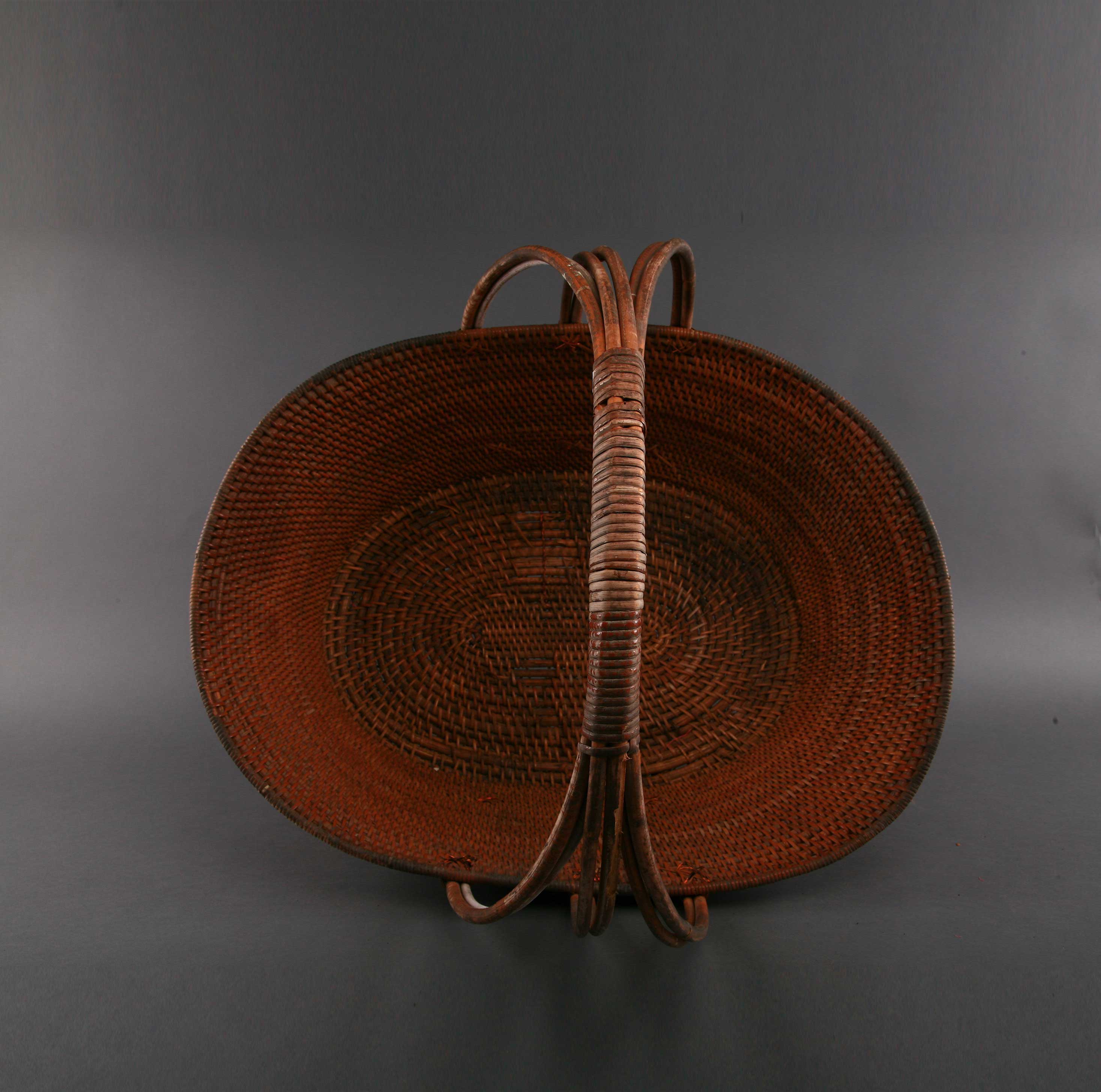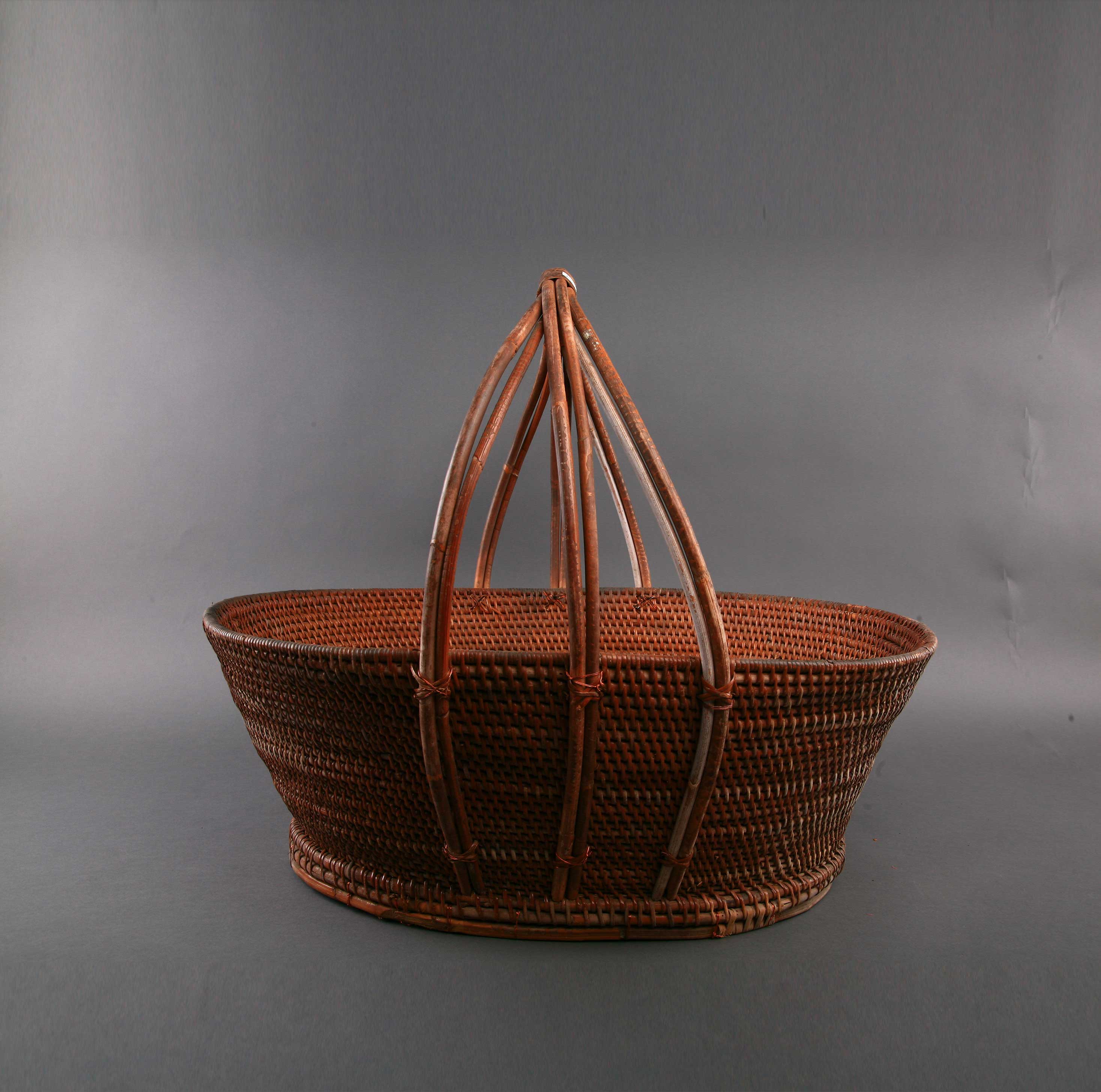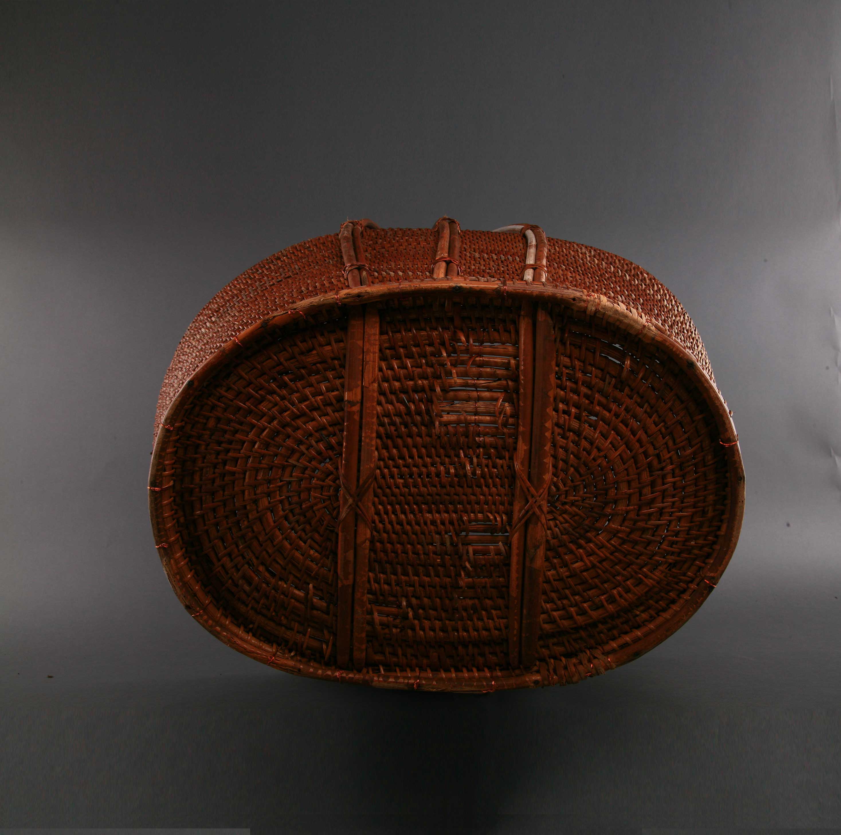 年代:20世纪;尺寸:长64.5cm,宽52cm,通高54.5cm。用藤编制。平面椭圆形,敞口,深斜腹向内,平底。两个长边侧面用三组藤在篮的上方形成提环,每组各为两条藤。是开平华侨从国外带回的婴儿摇篮。
