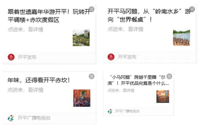 长期以来,开平市新闻宣传工作以本地媒体市融媒体中心、南方报业传媒集团(南方日报社)江门分社、江门日报开平记者站等上级主流媒体,以及各部门、单位政务新媒体为主力军,不断强化正面舆论引导,拓宽传播开平声音的渠道。自实施“百千万工程”以来,开平市坚持发挥媒体的信息传播、资源整合、品牌塑造、舆论引导等功能,打造了开平碉楼、赤坎古镇、开平马冈鹅等知名IP,以及“开平优品”行政区域品牌,使开平特色产品的曝光率、知名度、影响力显著提升。