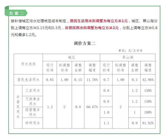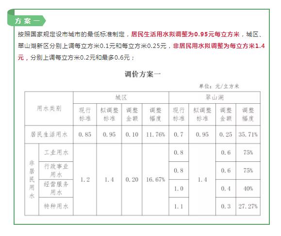方案一,按照国家规定设市城市的最低标准制定,居民生活用水拟调整为0.95元每立方米,城区、翠山湖新区分别上调每立方米0.1元和每立方米0.25元,非居民用水拟调整为每立方米1.4元,分别上调每立方米0.2元和最多0.6元;方案二,按补偿城区污水处理核定成本制定,居民生活用水拟调整为每立方米1元,城区、翠山湖分别上调每立方米0.15元和0.3元,非居民用水拟调整为每立方米2元,分别上调每立方米0.8元和最多1.2元。方案拟从2019年1月1日起执行。