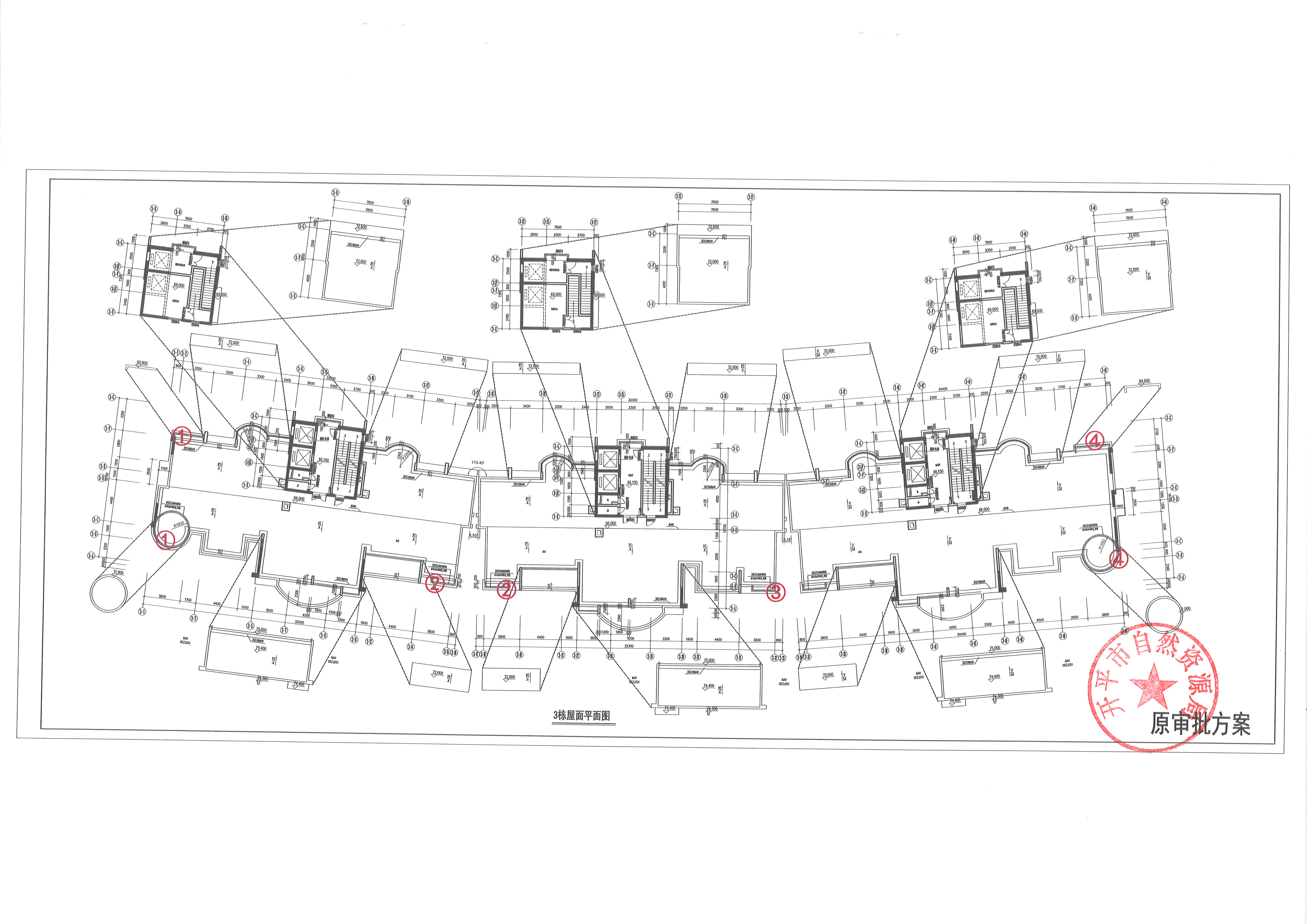 屋面层:①3-1至3-3轴交3-A轴至3-G轴取消屋面的玻璃幕墙装饰构件;②3-14至3-19轴交3-B轴取消屋面的玻璃幕墙装饰构件;③3-31至3-36轴交3-B轴取消屋面的玻璃幕墙装饰构建件;④3-48至3-49轴交3-A轴至3-G轴取消屋面的玻璃幕墙装饰构件(原22层的屋面部分)。