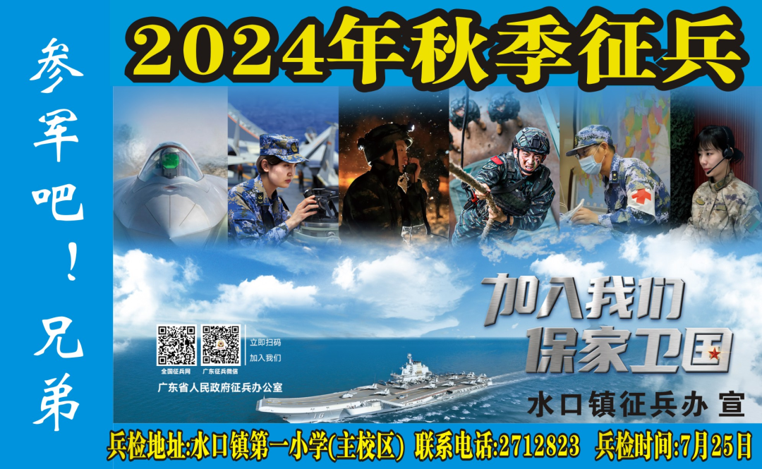 水口镇2024年下半年征兵体检工作将于7月25日在开平市水口镇第一小学(主校区)进行。